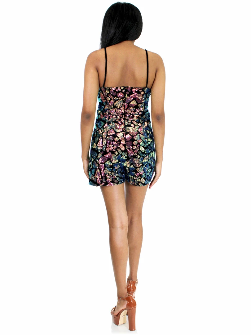 Marc Defang 6010 Black Romper, Fun Fashion. This black romper has iridescent multi patterned sequins throughout with a short satin detachable overskirt.Â