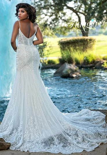 Adagio Bridal W9370 plunging v neckline sheer bodice and back long fitted mermaid wedding dress bridal gown with beaded lace that streams down the length of the skirt and train