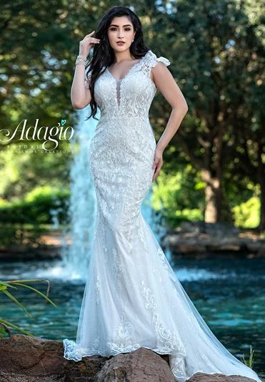 Adagio Bridal W9376 cap sleeves plunging neckline beaded sequin applique fitted mermaid wedding dress bridal gown