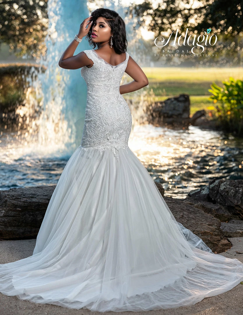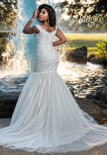 Adagio Bridal W9378 off the shoulder with plunging neckline and sheer panel mermaid wedding dress evening gown with long tulle train