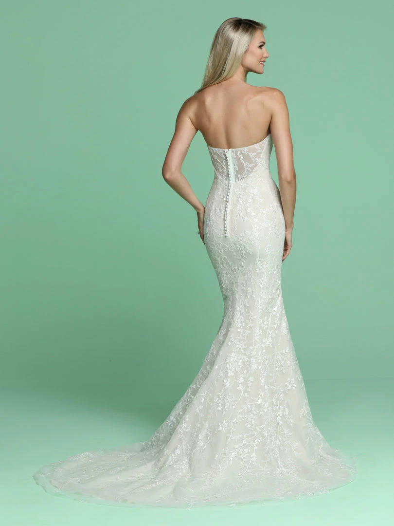 Davinci Bridal 50617 Long stunning Embroidered Tulle Fit & Flare wedding dress. Featuring a strapless sweetheart neckline with a sheer back. Buttons line the back of the gown. flowing into a sweeping train.Â