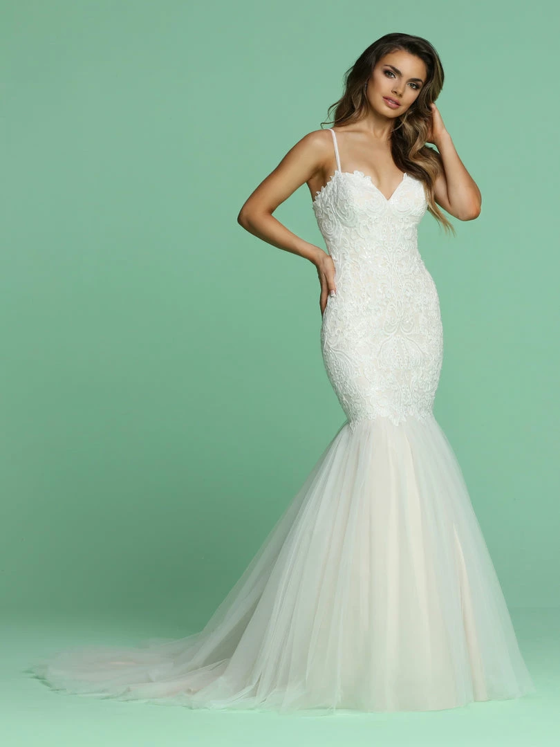 Davinci Bridal 50621 is a stunning sequin Embellished Embroidered Lace Fit & Flare Mermaid Wedding Dress. Featuring a soft Tulle Trumpet Skirt with a lush sweeping train. Lace up corset back.