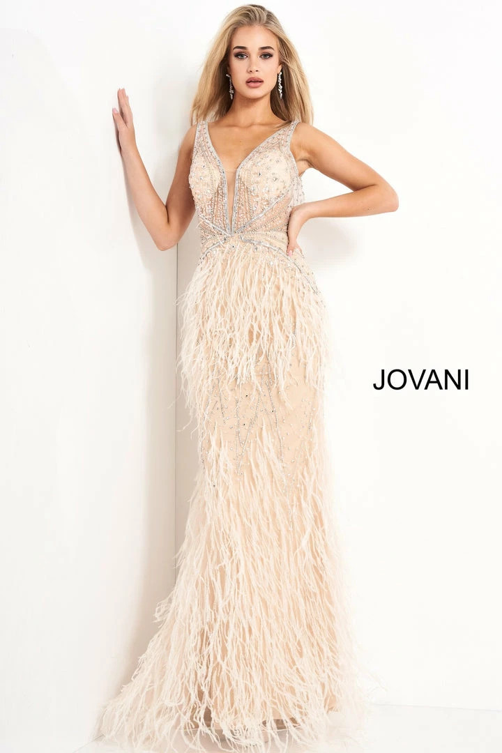 Jovani 03023 is a Long Feather Prom Dress, Pageant Gown, Wedding Dress & Formal Evening wear. This Sheer embellished bodice features a plunging v neckline with beading & crystal accents cascading through a feather embellished skirt. Very stunning and unique wedding dress!Â
