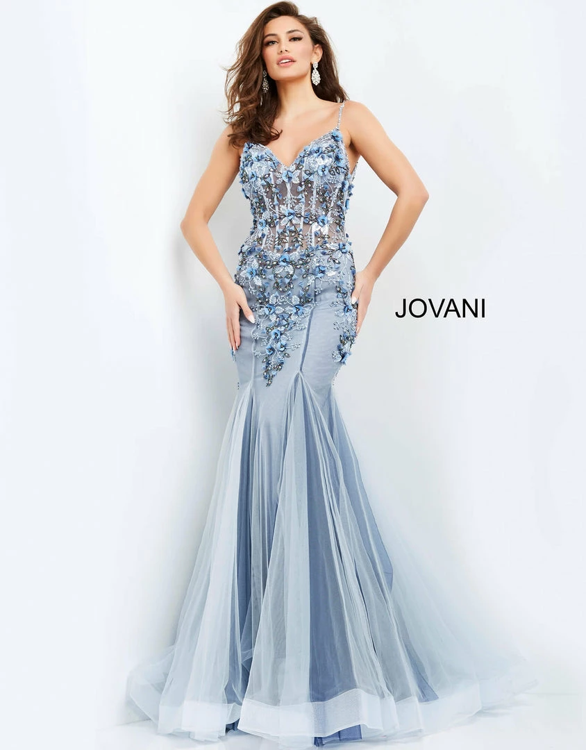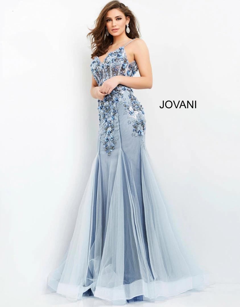 Jovani 05537 This is a long fit and flare prom dress with 3 D floral applique on the bodice and streaming down the dress. This evening gown has a sheer midriff and a v back. The mermaid skirt on this dress has a mermaid bottom with godets and horsehair trim.