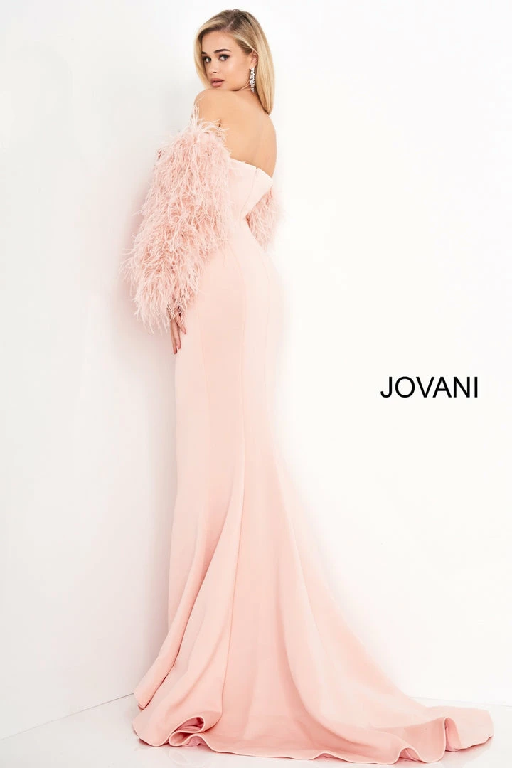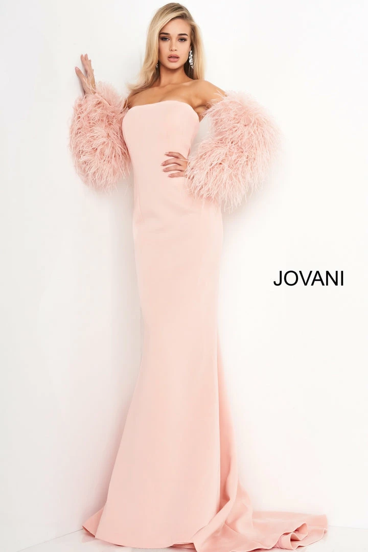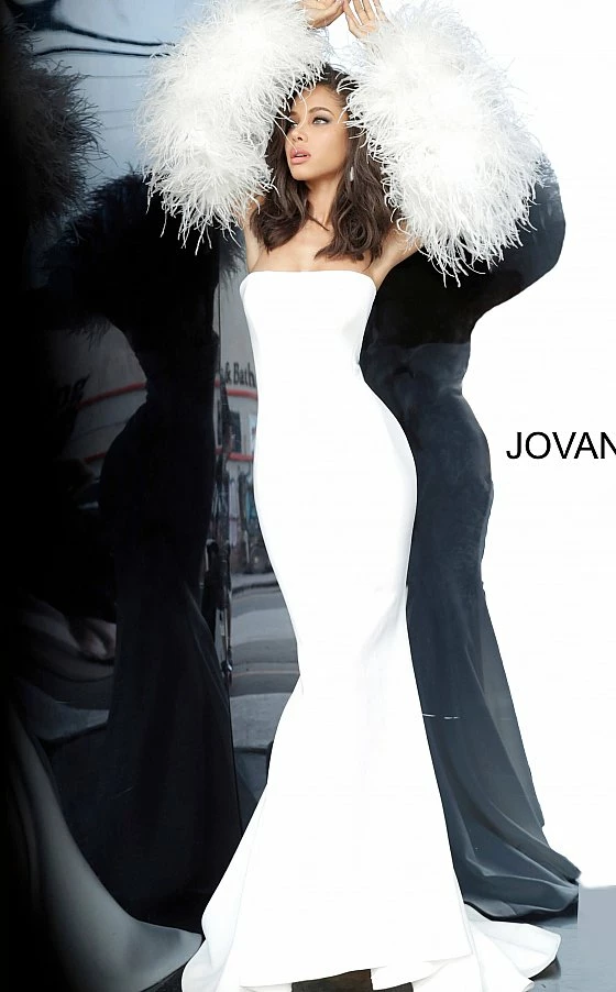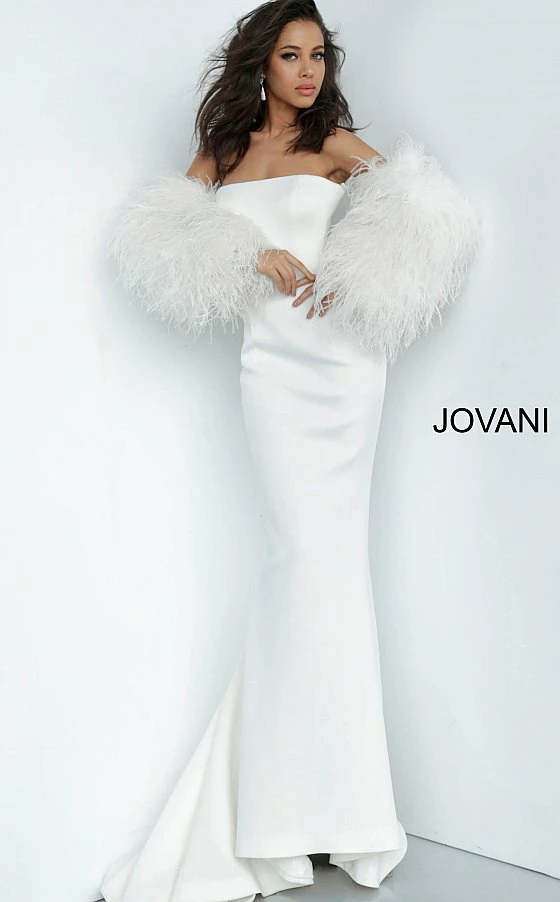 Jovani 1226 is a Long Fitted Mermaid Scuba Formal Evening Gown. This Straight neckline with Long Off the Shoulder Feather Sleeves. This Fit & Flare Wedding Dress Features a Lush Sweeping train. Great Red Carpet or formal event gown. Great for a wedding guest dress or mother of the bride gown. Stretch scuba fabric, form fitting silhouette, floor length with train, strapless bodice, straight neckline, ostrich feather sleeves.