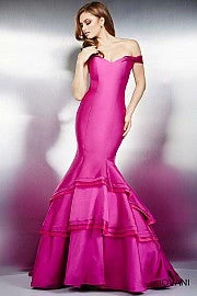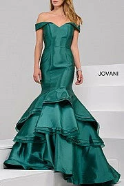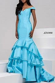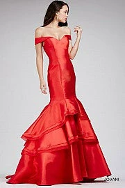 Jovani 31100 This fitted off the shoulder mermaid prom dress features a dramatic layered and tiered mermaid skirt. The sweeping train makes this your next perfect pageant gown.Â
