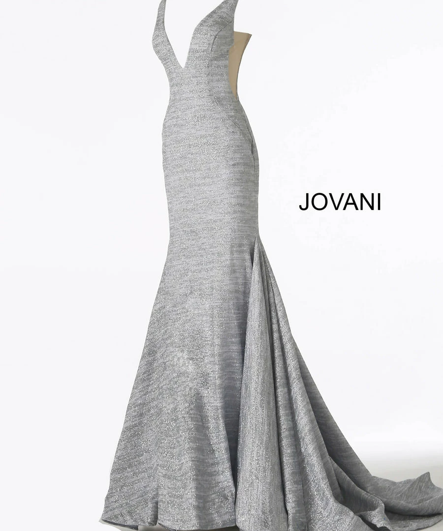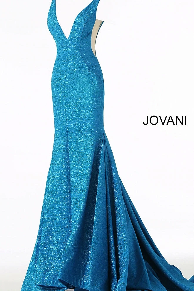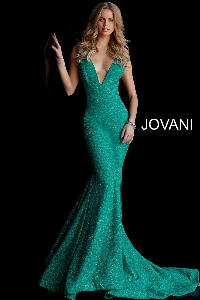 Jovani 47075 sleeveless bodice with plunging neckline, sheer side panels and open back long mermaid stretch glitter jersey prom dress pageant gown evening gown.