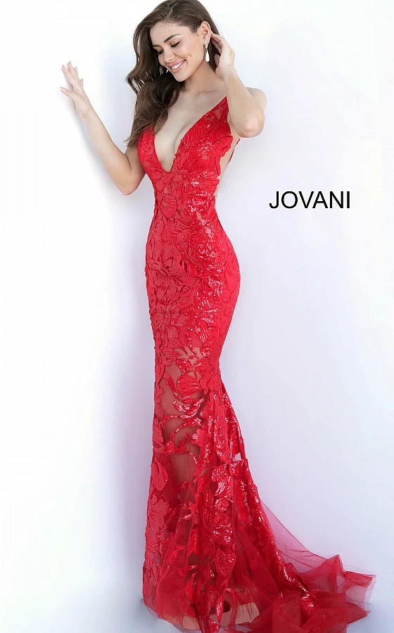 Jovani 60283 Plunging Neckline Prom Dress 60283 Evening Gown Sheer mesh, sequin flower appliques, form fitting silhouette, floor length, sleeveless bodice, plunging V neck, V back, sheer mesh inserts on the sides. Long sheer embroidered and sequined deep v-neck sleeveless formal gown with an open v-back by Jovani. sheer bodice & Top as well as skirt. Backless Dress Open Back Red Carpet DressÂ