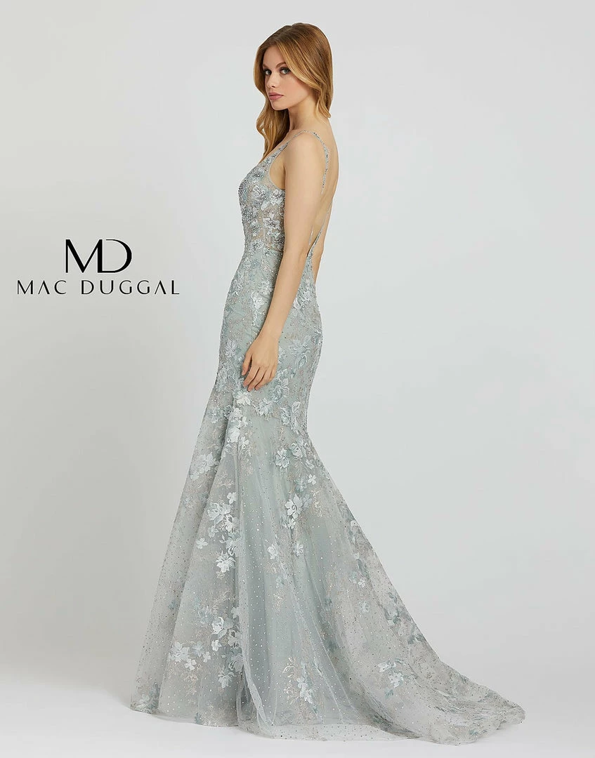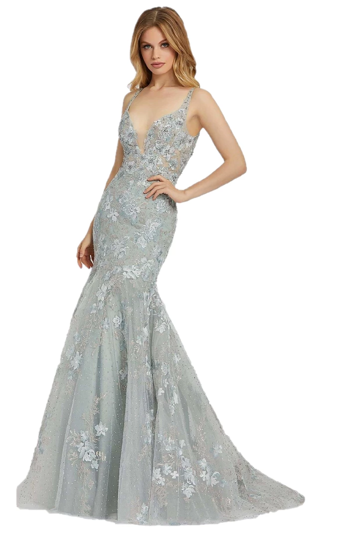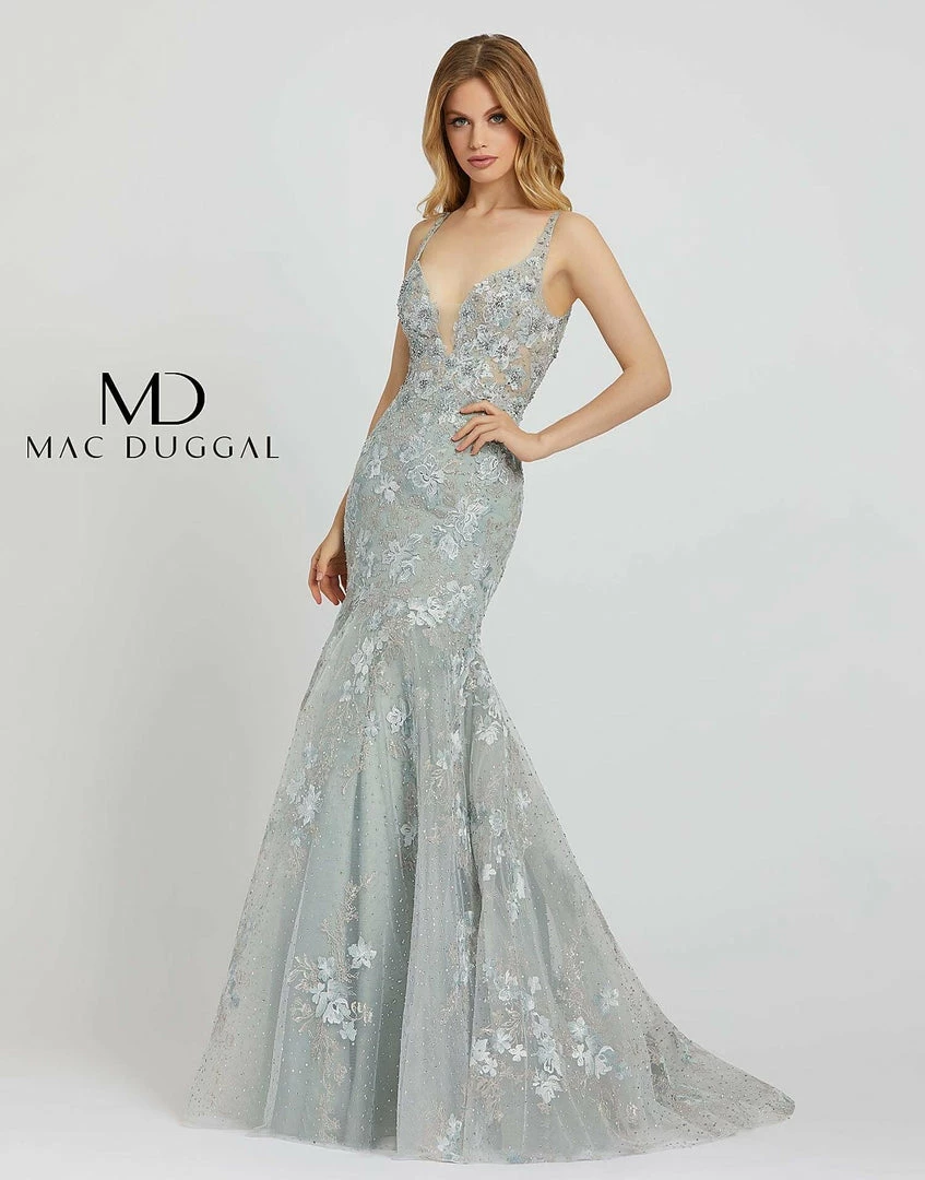 Mac Duggal 20206M – 20206 Sheer Fitted V Neck Embellished Lace bodice, with a Mermaid trumpet skirt & sweeping train. Prom Dress Backless Pageant, beautiful v-neckline gown with a beading, and perfect floral embroidered detailing. 20206M sea mist formal gown is fashioned in beaded floral embroidery, with mesh insert plunging neckline and plunging V-back. The illusion bodice is offset with a fully-lined skirt that spills to a court train.