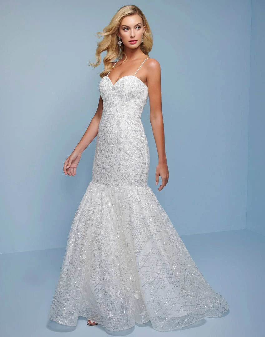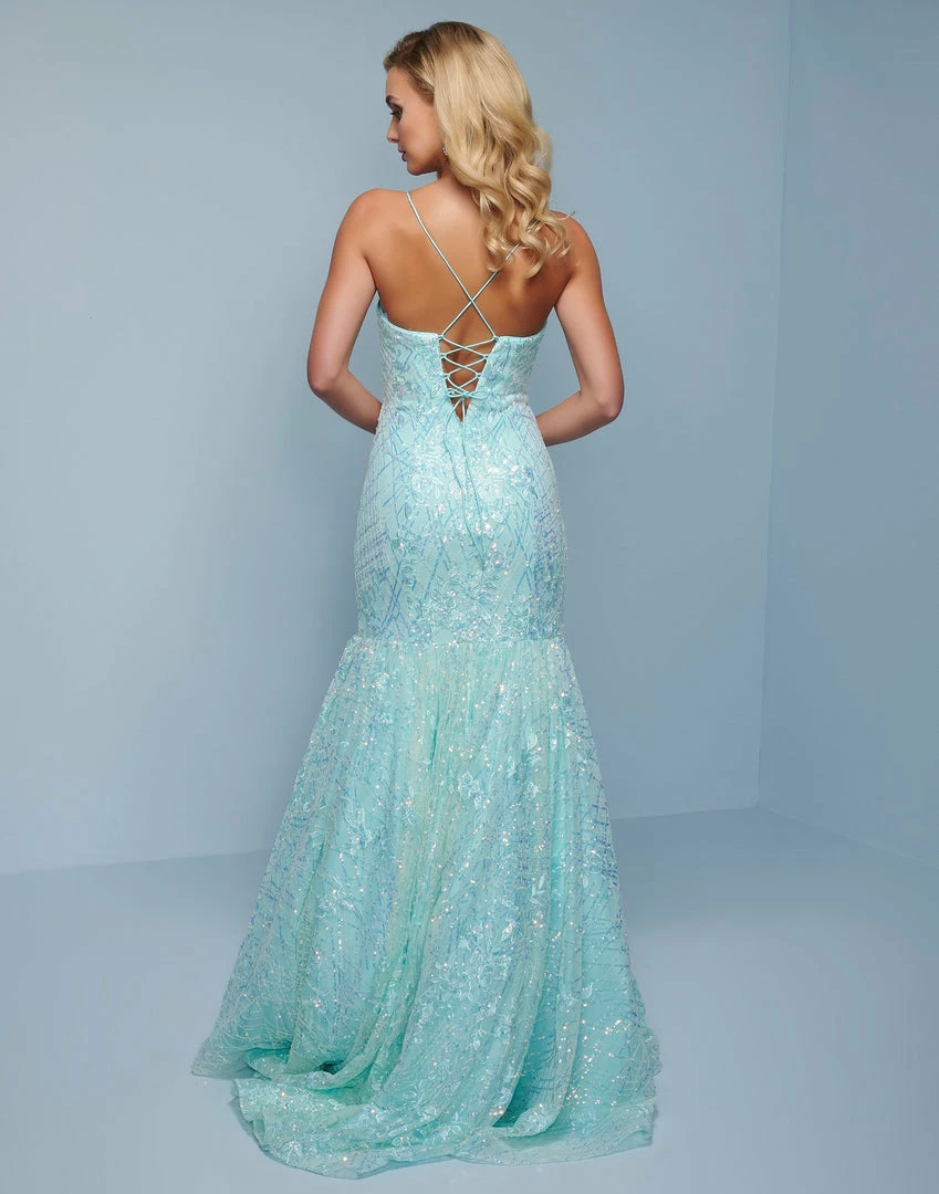 Splash Prom K547 This is a sweetheart neckline mermaid prom dress that is embellished throughout with sequins.Β This formal evening pageant gown has thin spaghetti straps and a lace up and tie corset back.Β This dress is perfect for pageants and has a sweeping train.