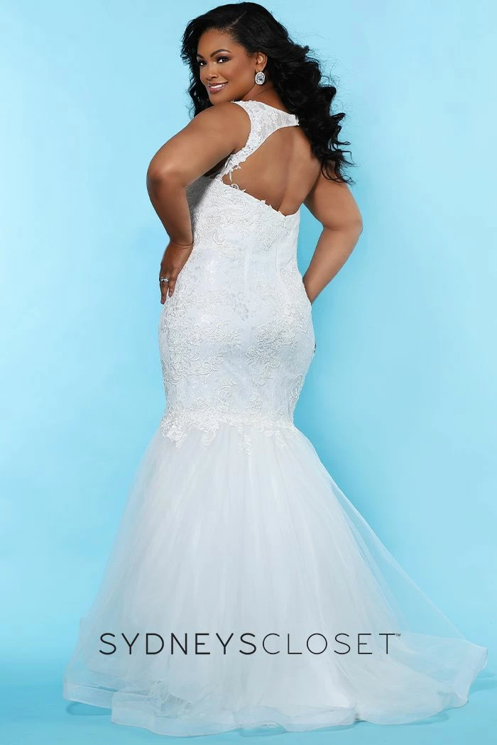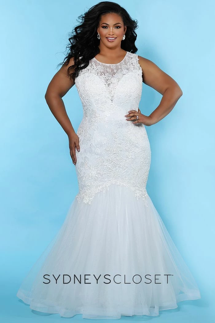 Sydney’s Closet SC5231 Tiana This plus sized wedding dress has a high sheer lace neckline with a sleeveless design. The back of this mermaid bridal gown has a sexy cutout. The tulle mermaid skirt has a sweeping train. SC 5231