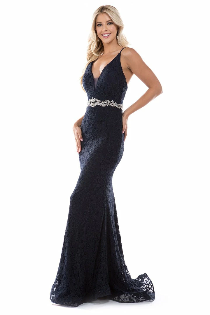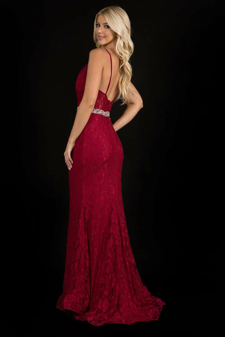 Nina Canacci 2295 Plunging neckline with mesh panel spaghetti straps long fitted prom dress evening gown with embellished belt.