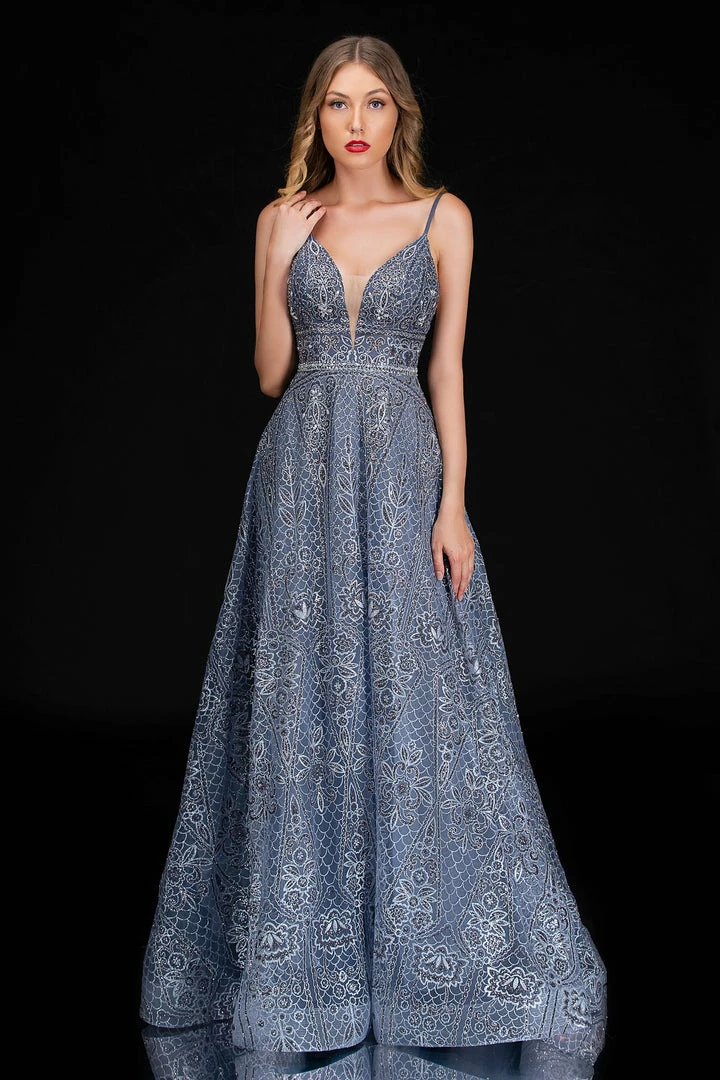 Nina Canacci 8187 This is a long embellished A line prom dress with a plunging neckline.Β This evening gown has a low back and a small train.Β