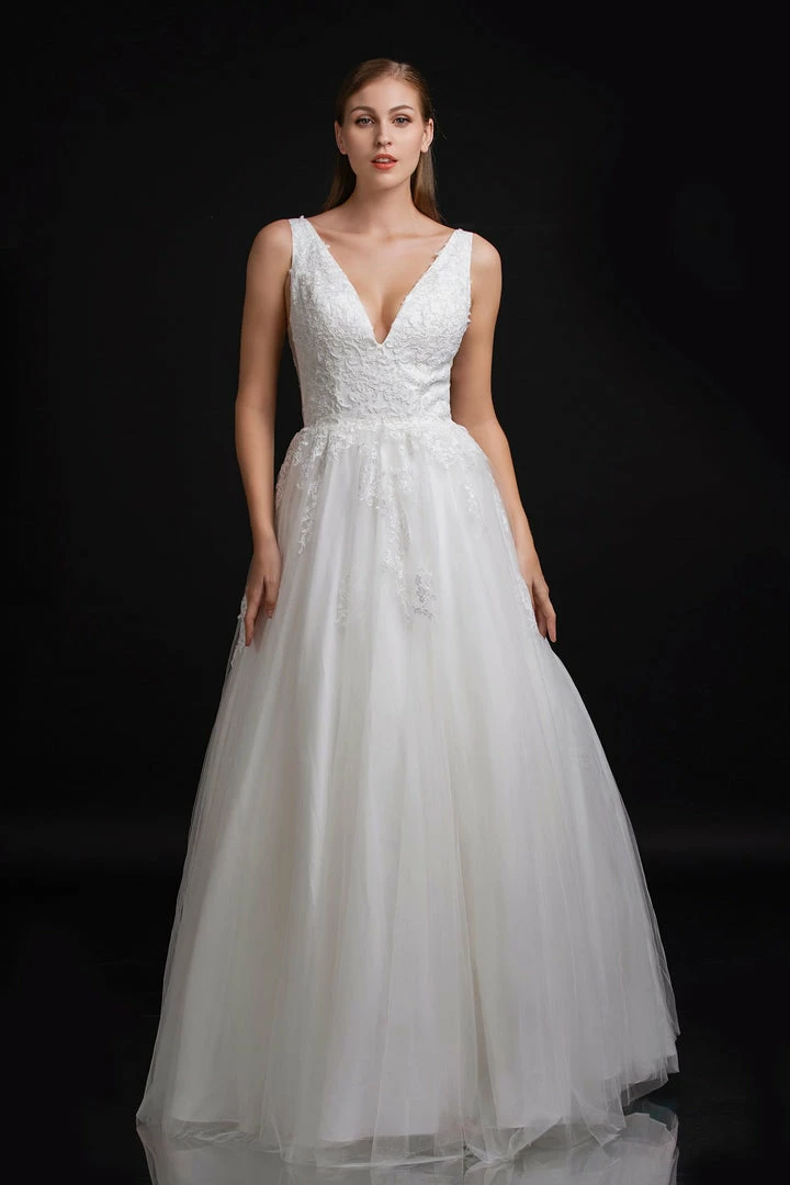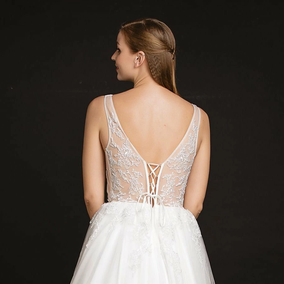 Nina Canacci B110 v neckline with wide straps lace bodice A line wedding dress bridal gown with sheer lace back and lace up corset