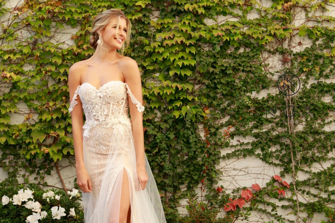 A romantic update to the traditional bohemian style, falls in love with this boho wedding dress with the empire waist by NOX ANABEL. This long dress features an off the shoulder sweetheart neckline on a fitted bodice adorned with tussle lace embellishments. It displays a thigh-high slit and uses tulle fabric that is perfect for a memorable wedding day. This relaxed fit-and-flare silhouette features a soft sweetheart plunge and off-shoulder neckline for an elegant and universally flattering shape. Its organza layers reaching over the sides of the hips and midsection to elongate the frame and sculpt the figure.