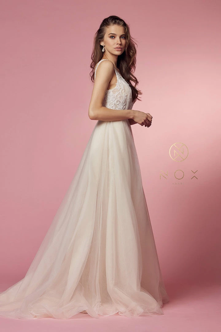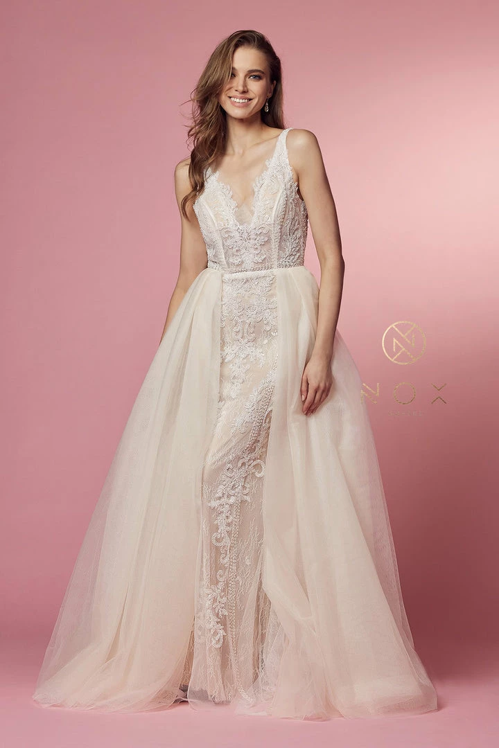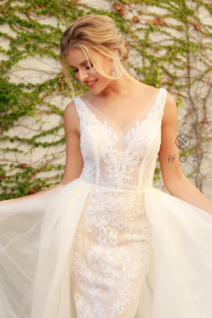 Nox Anabel E474 Long Lace Fitted Wedding Dress Overskirt Destination Bridal Gown SequinsÂ