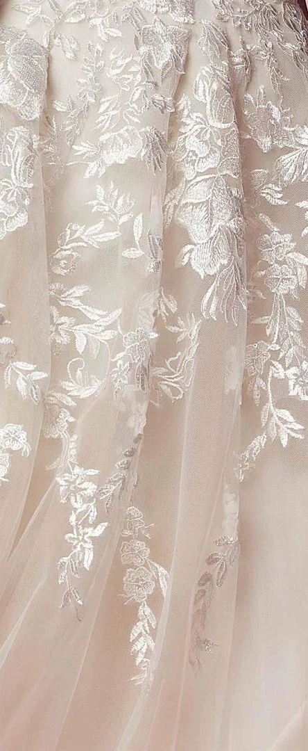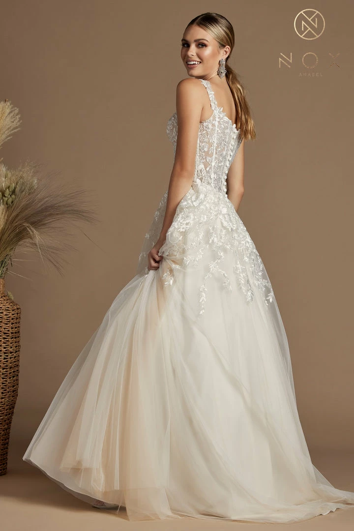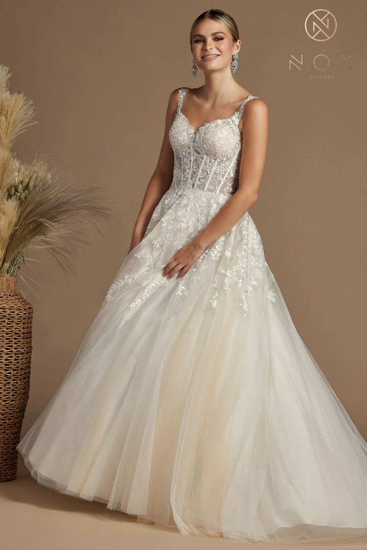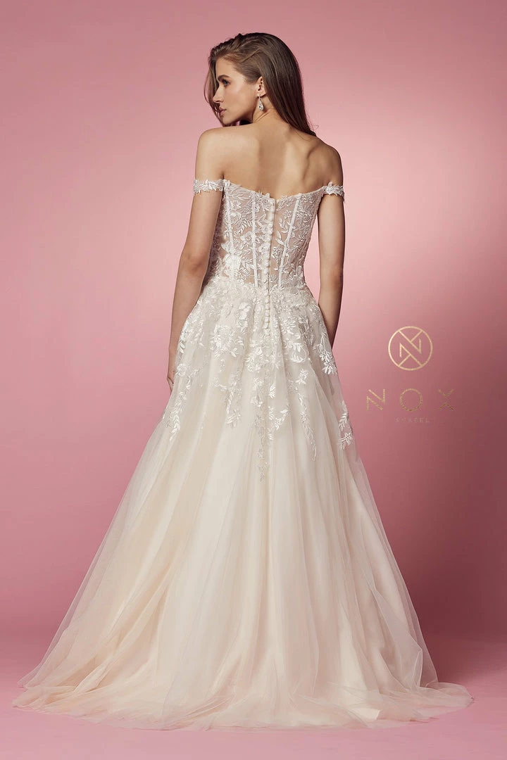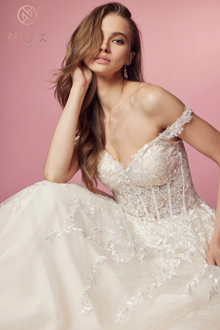 Nox Anabel JH925 Long A Line Ballgown Wedding Dress Sheer Lace Off the Shoulder Bridal Gown. Corset Style Boning in bodice of dress. Floral Lace of sheer bodice & tulle A line Ball Gown Skirt.