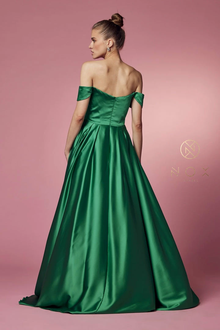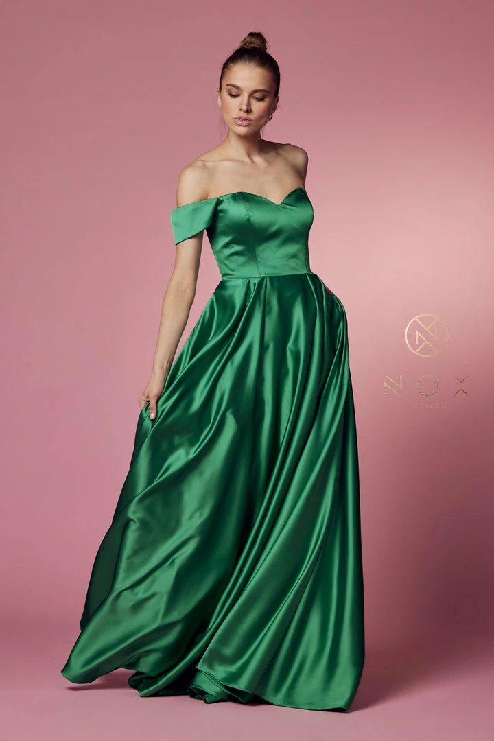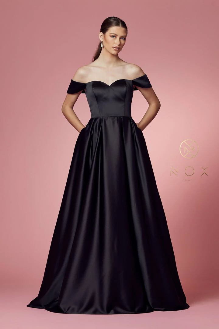 Nox Anabel R1032 Long satin formal off the shoulder evening dress pockets prom gown. A line ball gown with pockets perfect for any formal event or wedding.