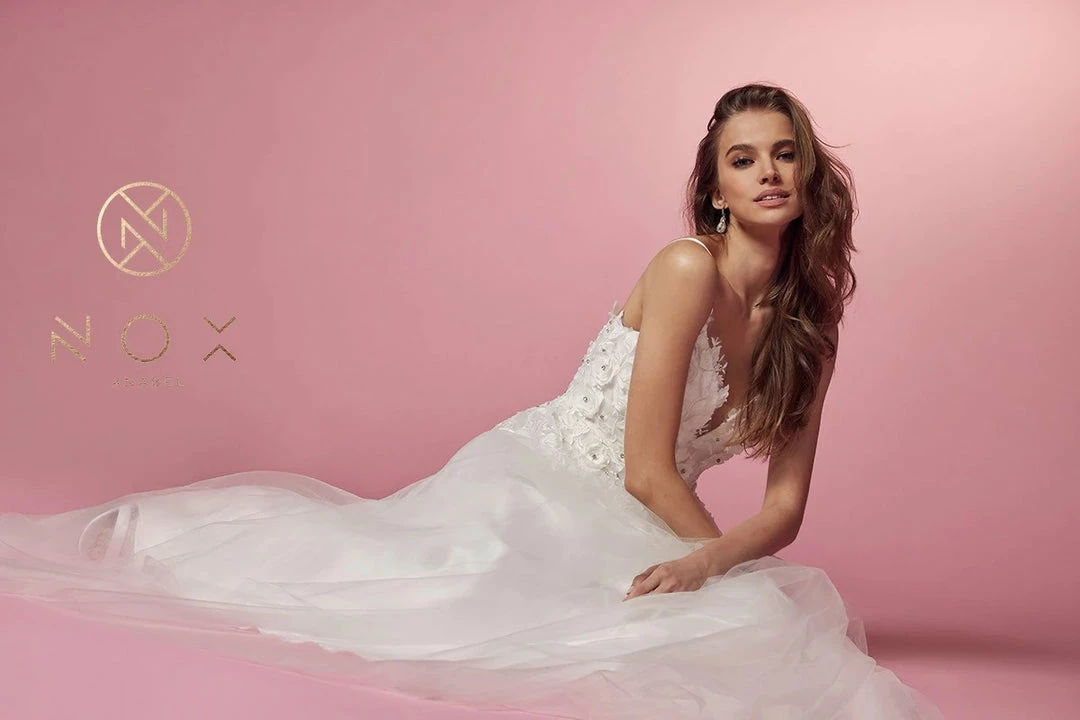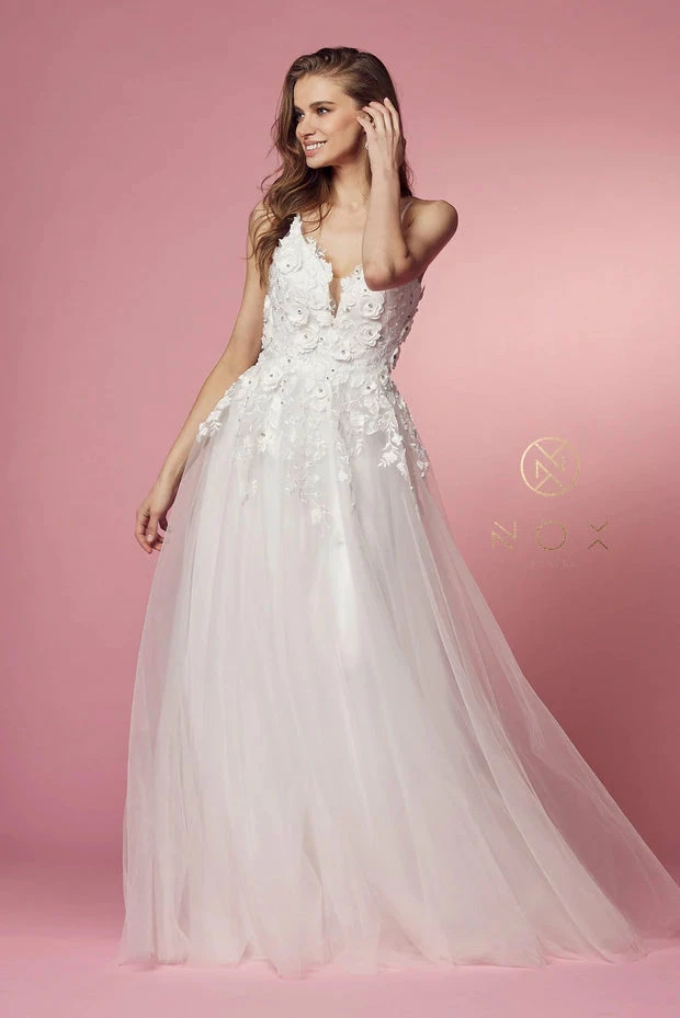 Nox Anabel R346 Long A Line 3D Floral Lace Wedding Dress Bridal Gown. Sleeveless, 3D Floral Appliques, Rhinestones, Illusion Inset, Spaghetti Straps, Embroidery, Mid-Open Back, Back Zipper, Sweep Train 3-dimensional floral appliques and shimmering jewels, this ensemble shows a deep v-neckline with an illusion inset. The back is designed with a mid-open accent as trailing embroidered details trail from the waist. The ethereal A-line skirt softly flutters into a full-length hemline.Â