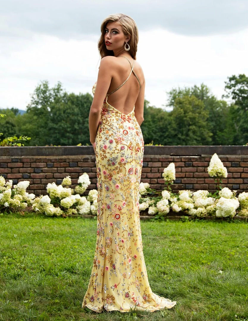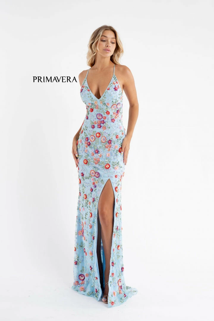 Primavera Couture 3073 Long V neckline beaded long prom dress with side slit and open back evening gown, formal pageant dress. Fully Beaded & Embellished Floral Pattern! Backless with slit in skirt