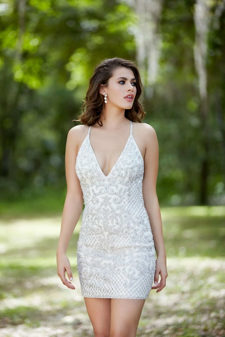 Primavera Couture 3138 plunging v neckline beaded fitted sequins short homecoming dress cocktail dress with open back and criss cross straps. Ivory short prom reception dress. Short Prom Dress, Homecoming Dress, Cocktail Dress, Formal Wear Gown.