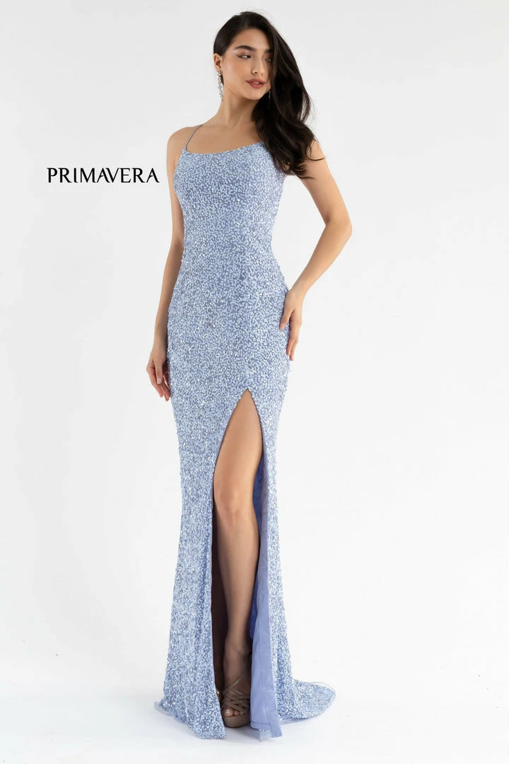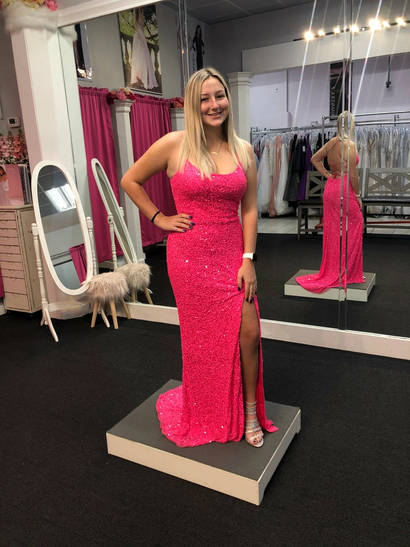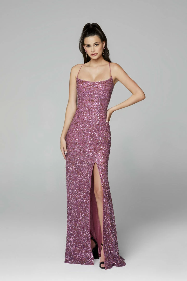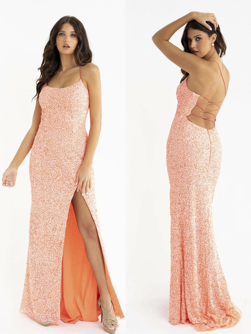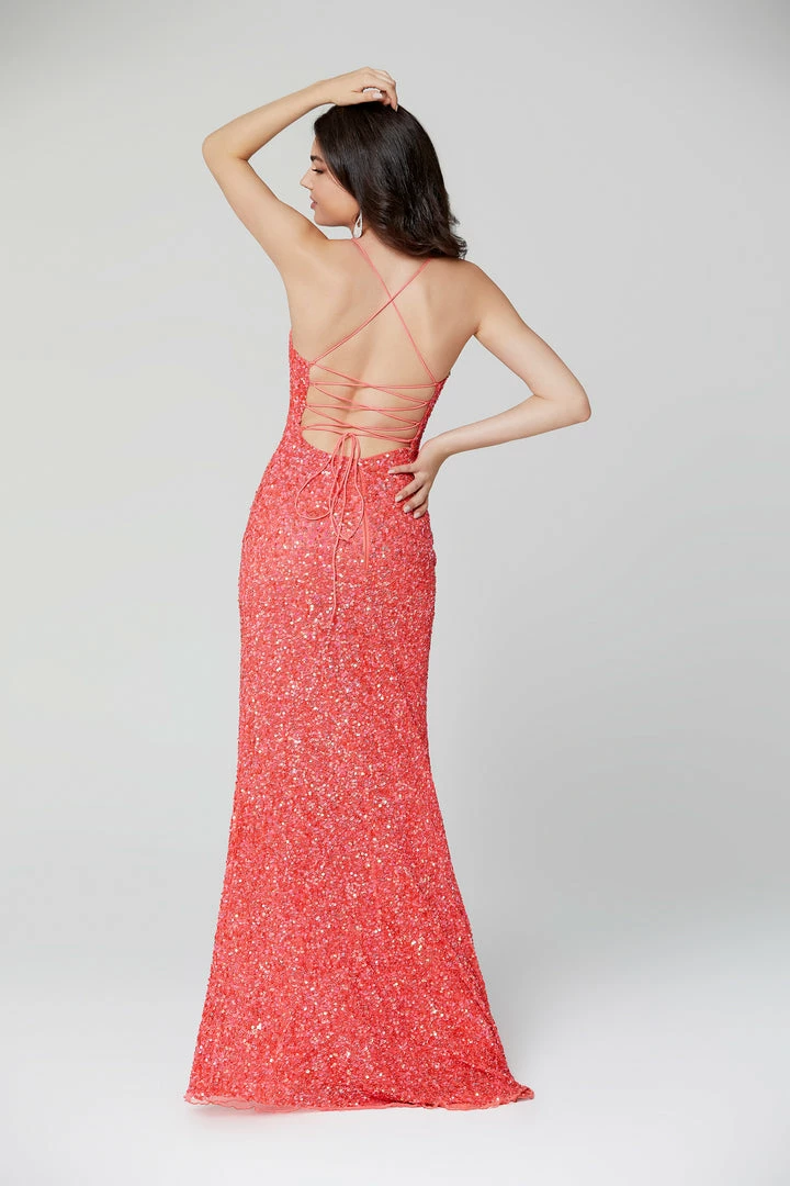 Primavera Couture 3290 This prom dress adds a pop to the multi sequins dress. With a scoop neckline and spaghetti straps that cross and tie in the back. This long evening dress has a side slit. And need I say, NEON!