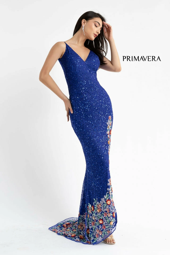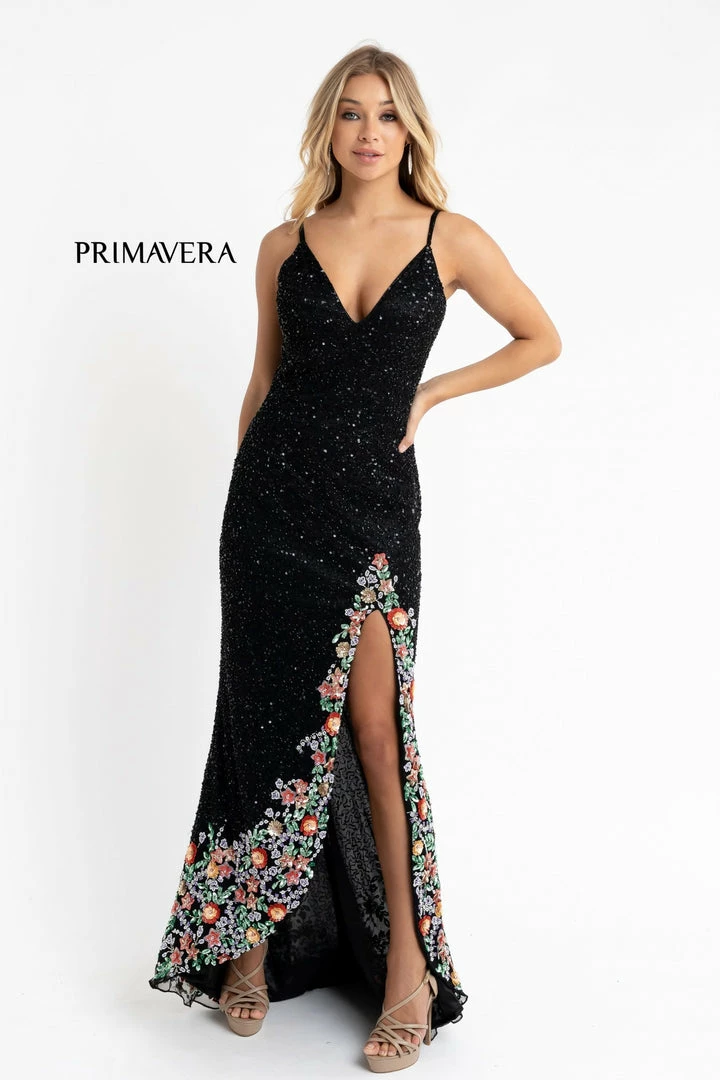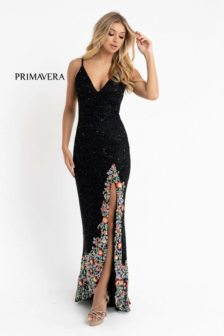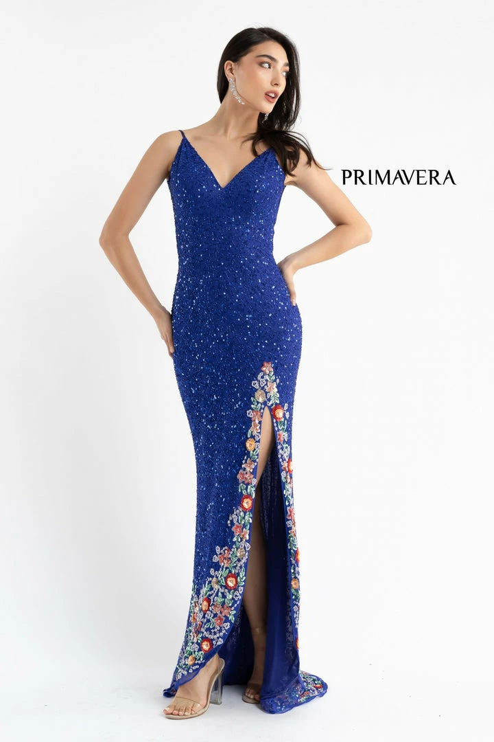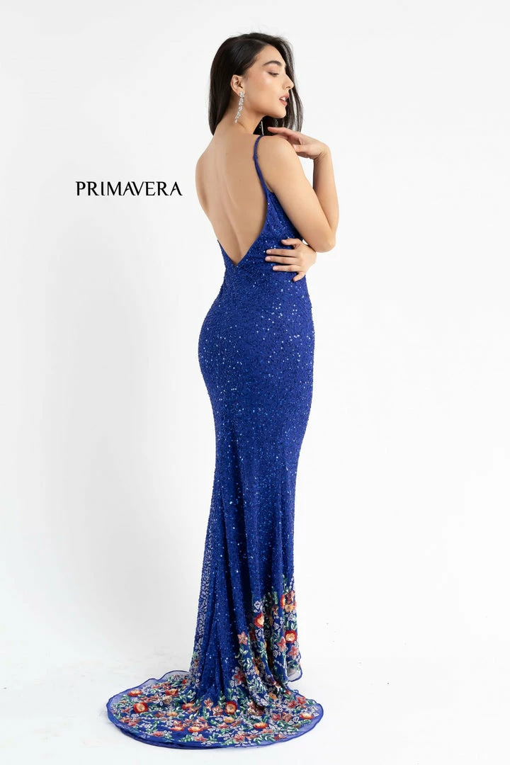 Primavera Couture 3618 is a long fitted formal evening gown or prom dress. It has a V Neckline with beaded spaghetti straps and an open v back. The dress is Fully Embellished with Sequins & Beading. Floral Details cascade around the slit in the skirt and wrap around to the sweeping train. Floral details are comprised of sequins & Beading. Great Prom, Pageant & Formal Dress!