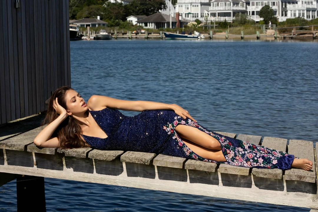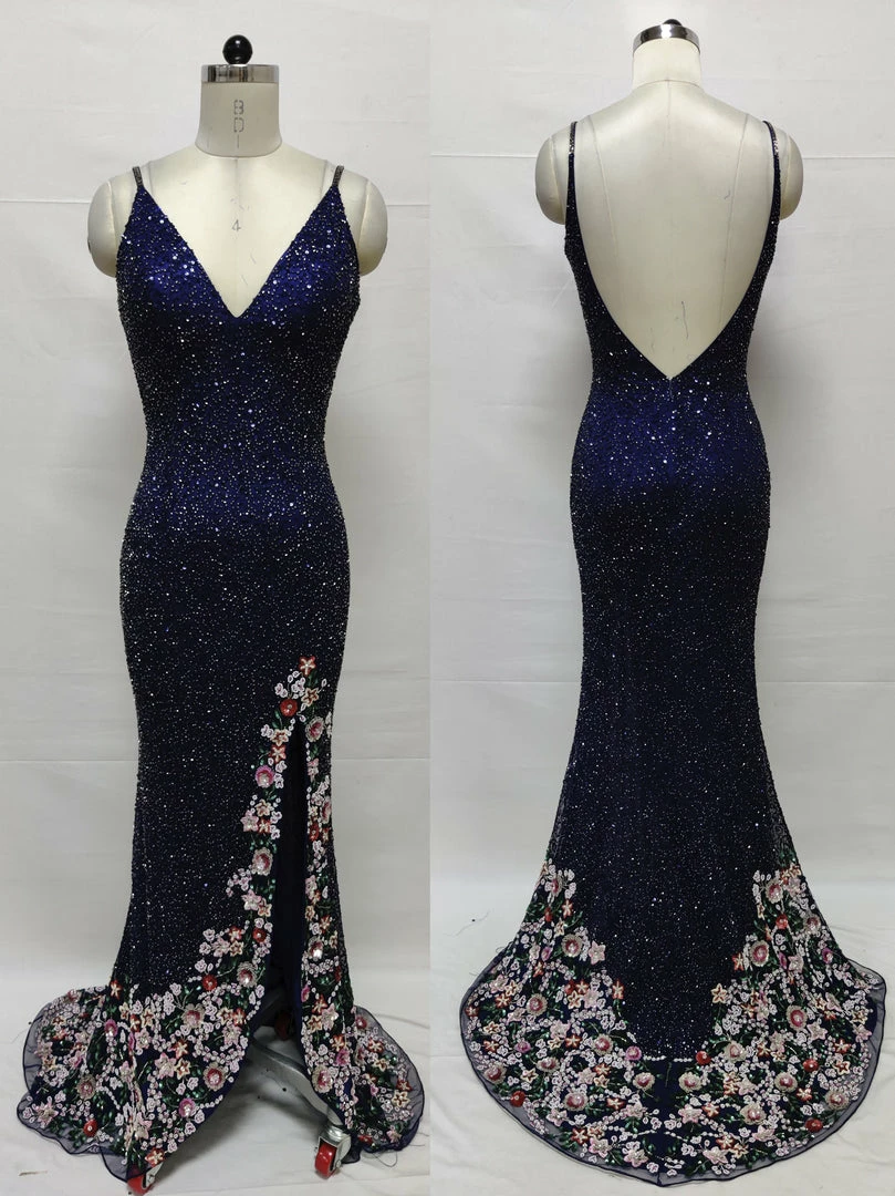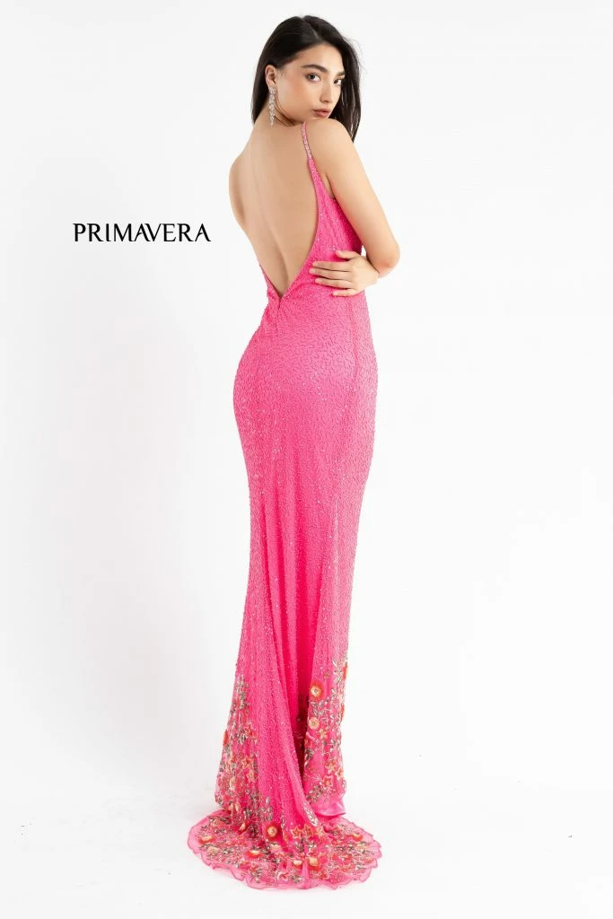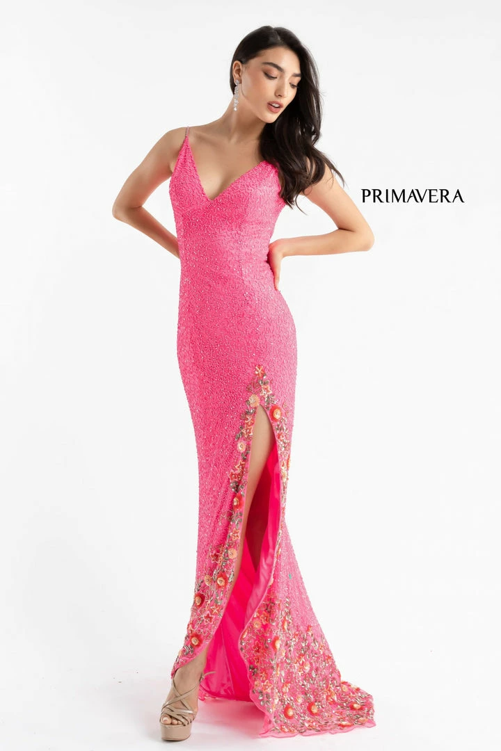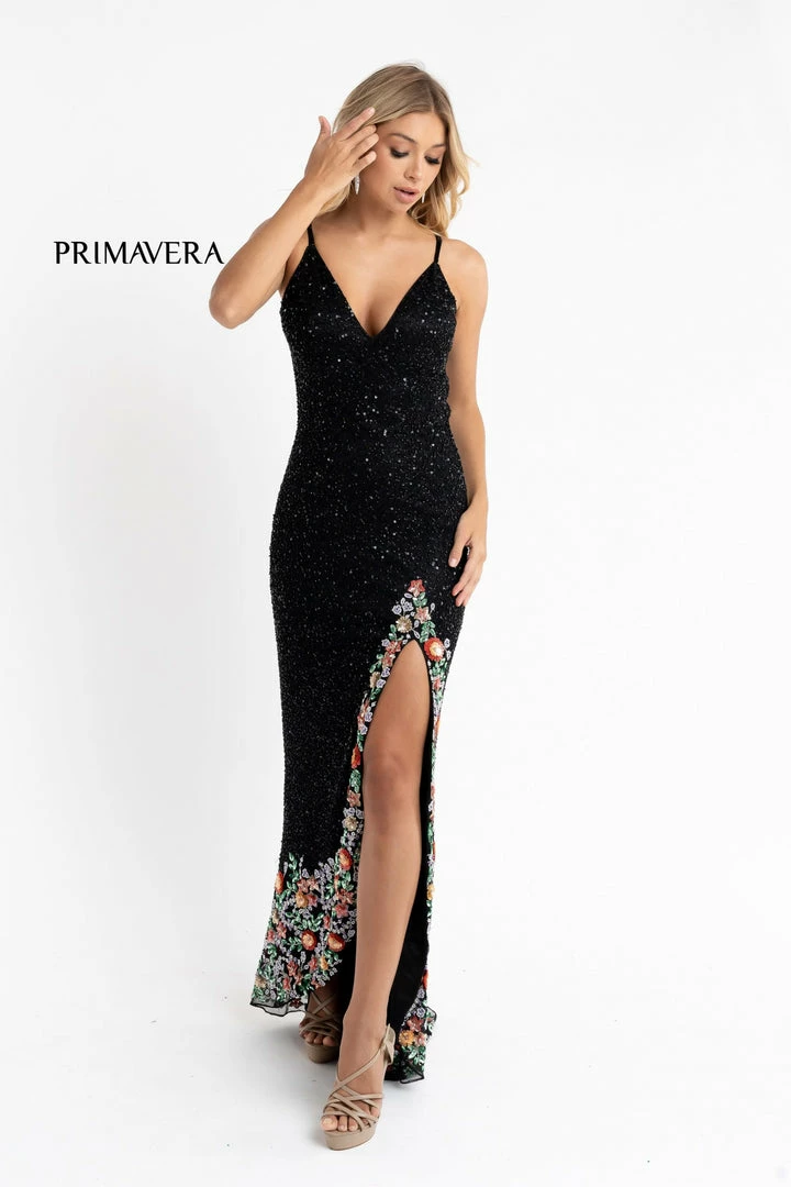 Primavera Couture 3618 is a long fitted formal evening gown or prom dress. It has a V Neckline with beaded spaghetti straps and an open v back. The dress is Fully Embellished with Sequins & Beading. Floral Details cascade around the slit in the skirt and wrap around to the sweeping train. Floral details are comprised of sequins & Beading. Great Prom, Pageant & Formal Dress!
