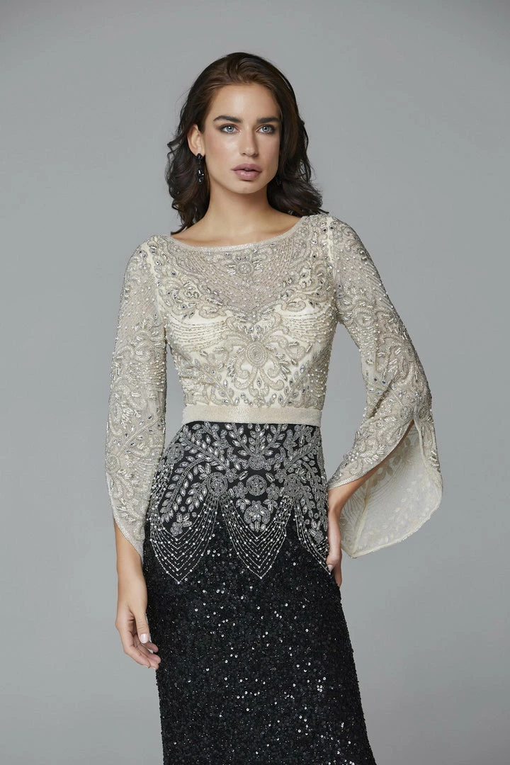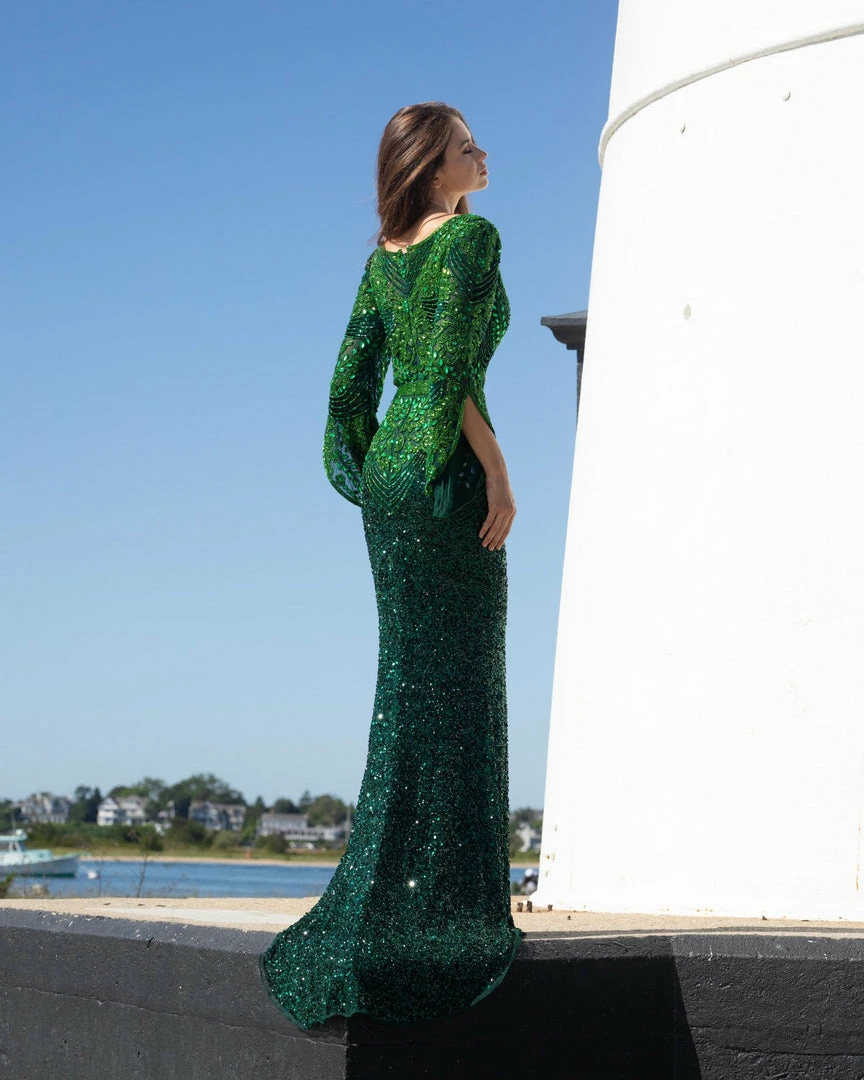 Primavera Couture 3680 This is a long hand beaded evening gown with a bateau neckline and sheer long embellished bell sleeves. It is multi colored and fitted to the floor with an embellished waistline and sweeping train.