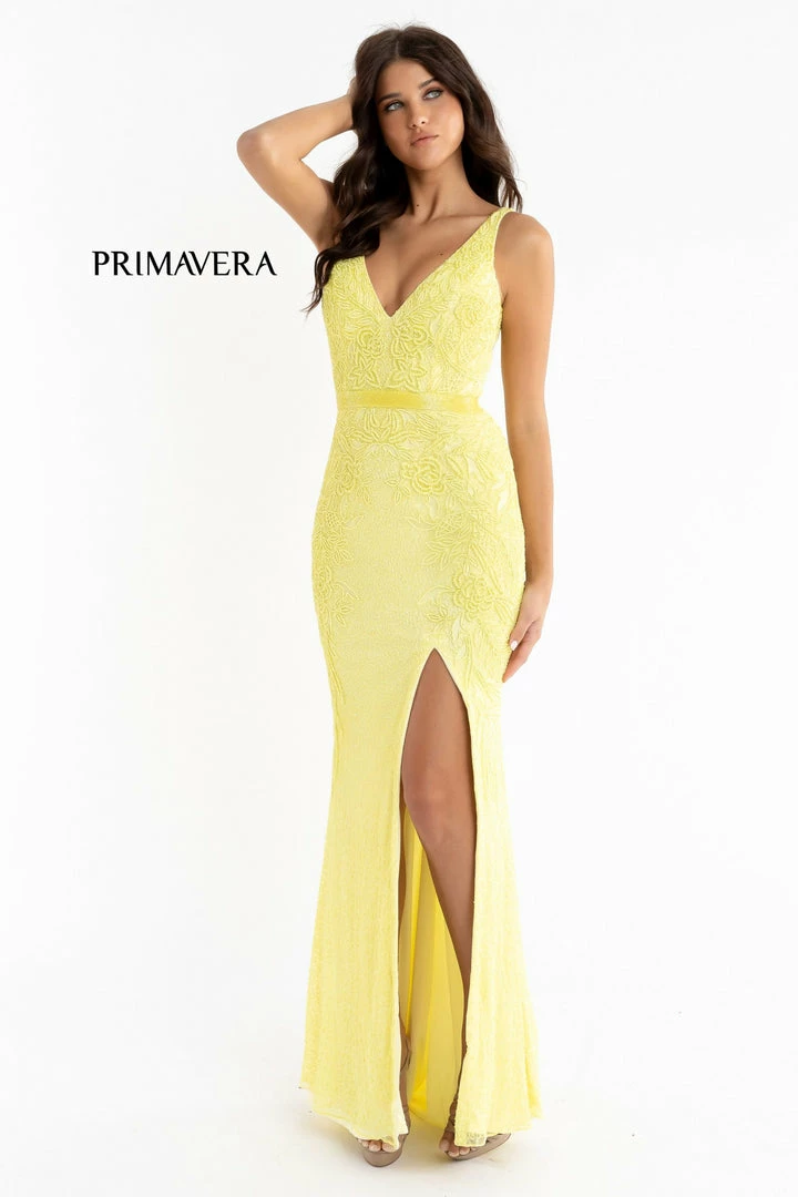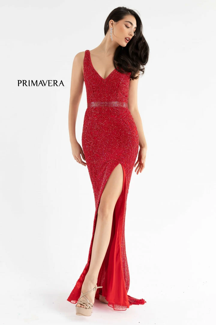 Primavera Couture 3725 This is a long floral beaded prom dress with a v neckline, wide straps and a mid v open back. The bodice is beaded with floral details to the thin horizontal waist. The pattern continues down the sides of the dress and finishes in tiny bugle beading, with a slit and a sweeping train.