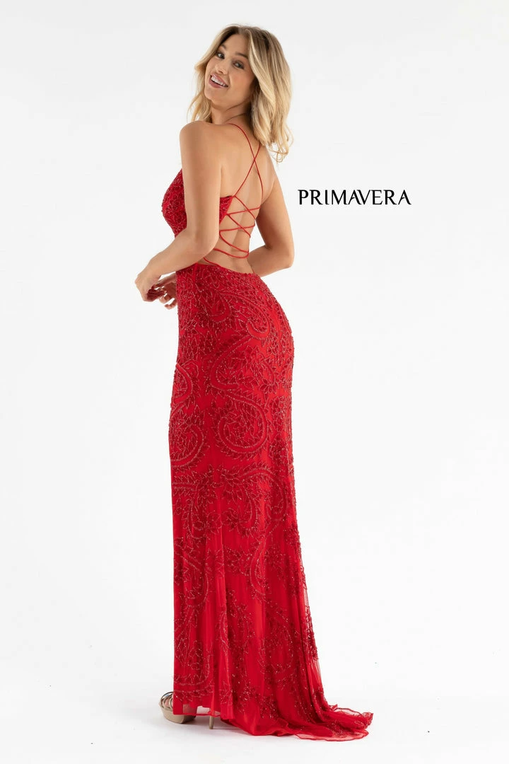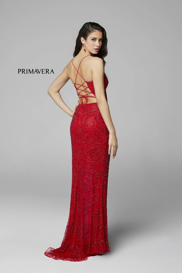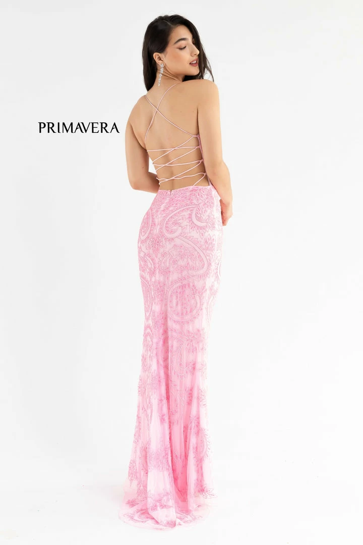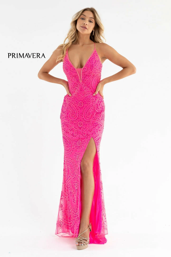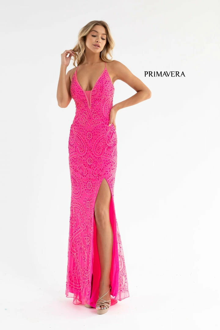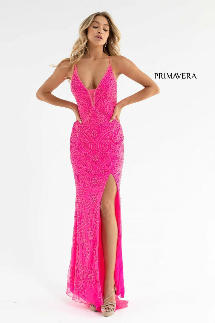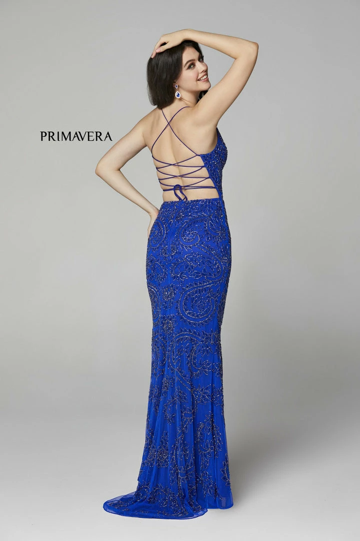 Primavera Couture 3734 This is a long hand beaded prom, pageant and formal evening gown that is beaded with the most intricate design. It has a v neckline and a lace up tie back with a side slit.