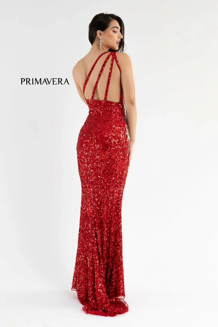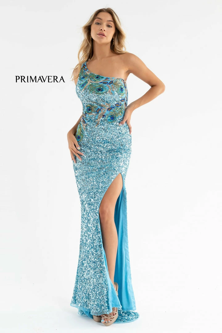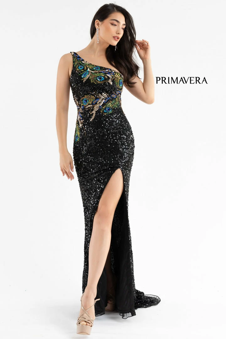 Primavera Couture 3738 This is a long beaded fitted formal Prom and Evening Gown. It has one shoulder strap with beaded peacock feathers along the asymmetrical neckline. The back has 4 straps that flow from the shoulder across the back. Excellent for an evening affair.