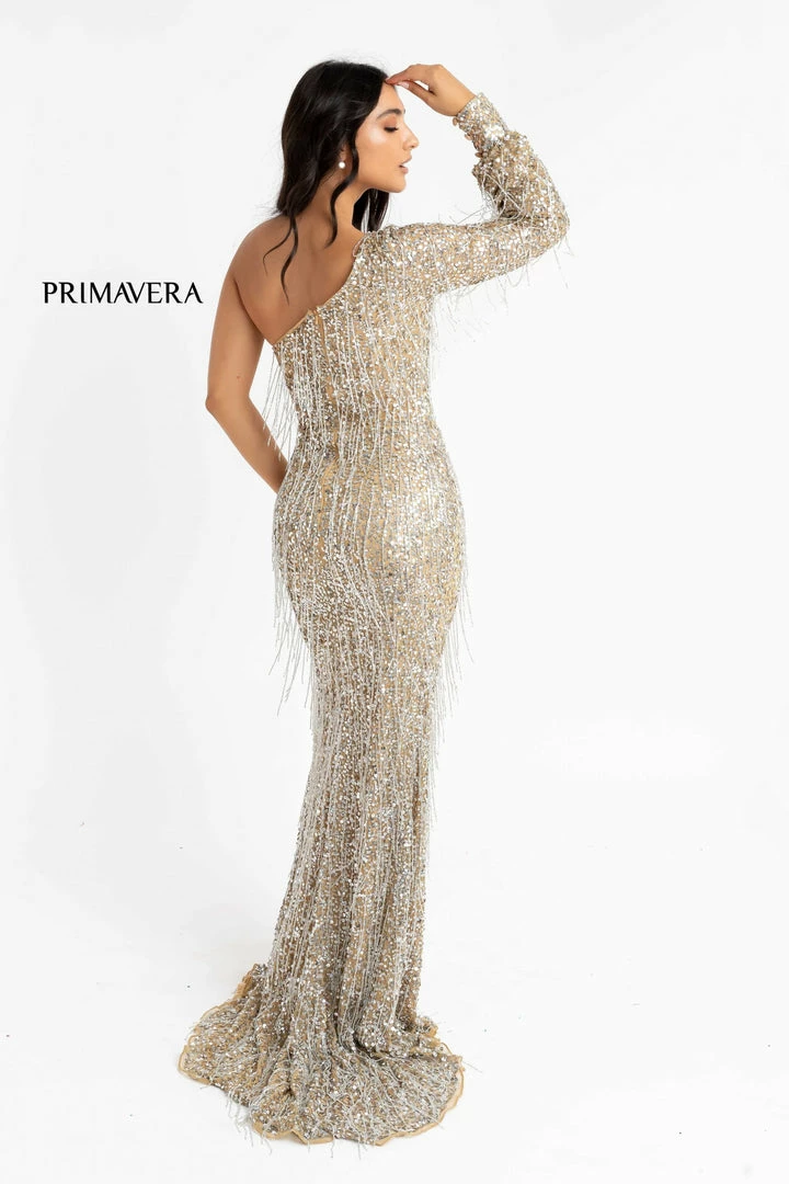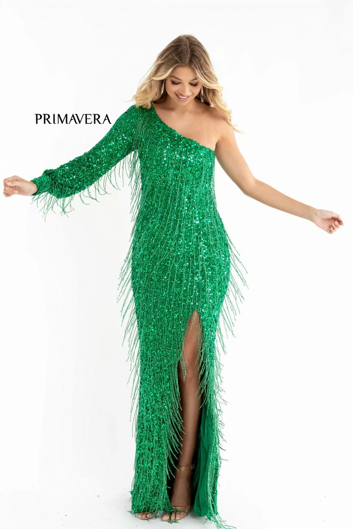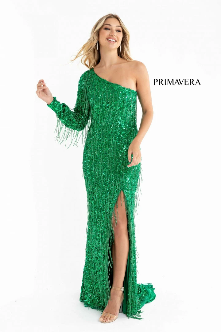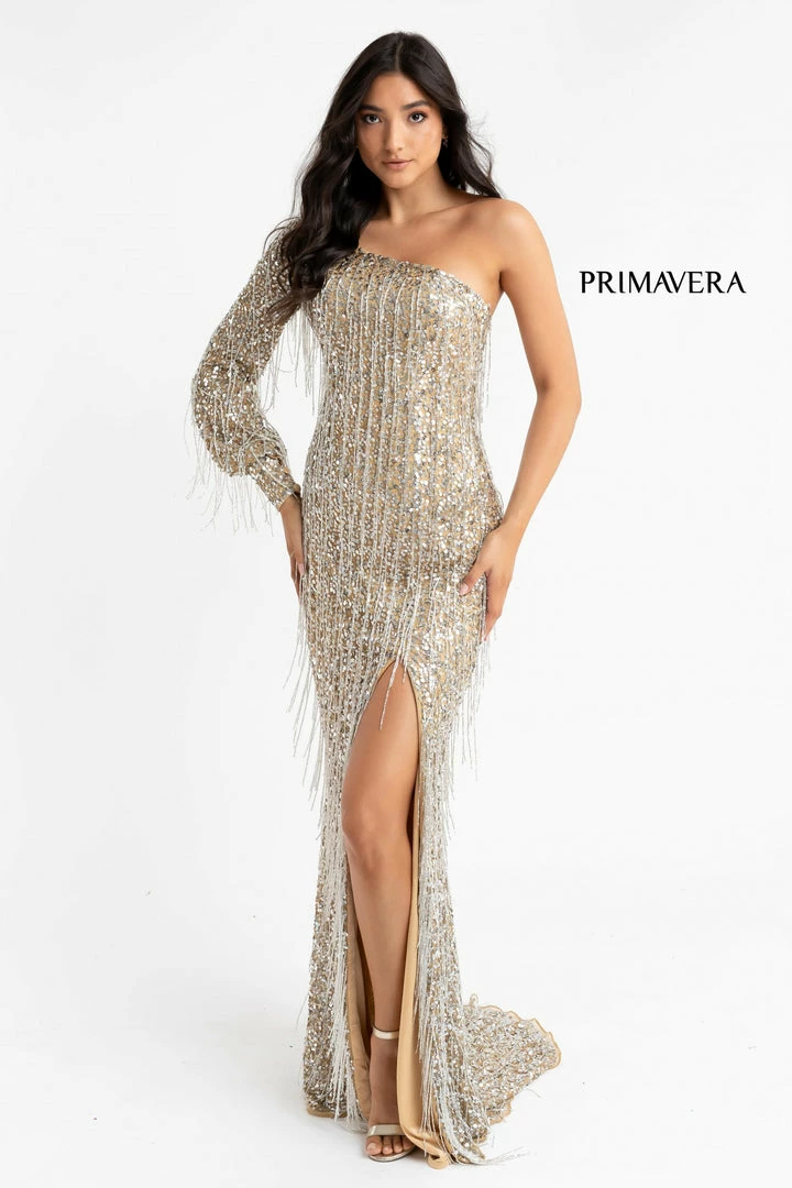 Primavera Couture 3739 This gorgeous prom, pageant and evening gown is dripping in fringe.Β The dress has one long sleeve on a one shoulder style.Β It ends with a slit and a sweeping train.