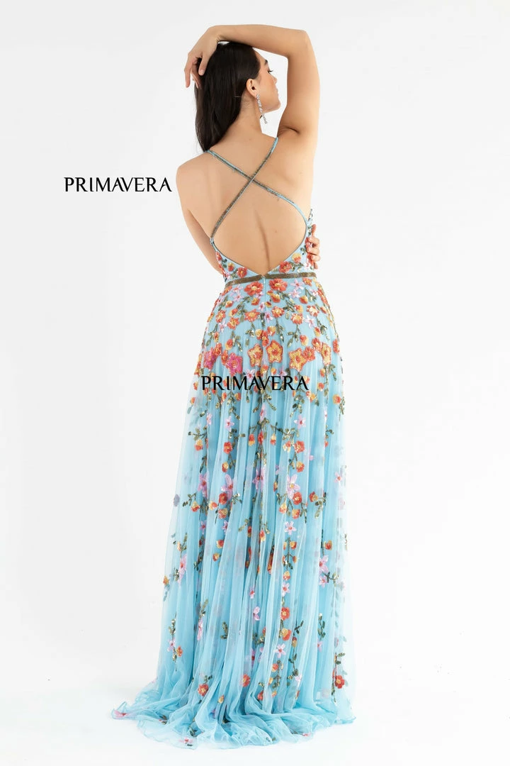 Primavera Couture 3740 This is a long beaded prom dress that is beaded with flowers throughout. It has a V neckline with beaded spaghetti straps that crisscross in the open back. The waistline has a beaded belt. This beautiful gown is a good choice for prom or an formal evening event.Â