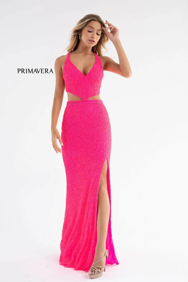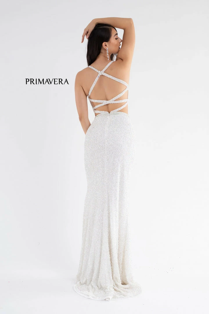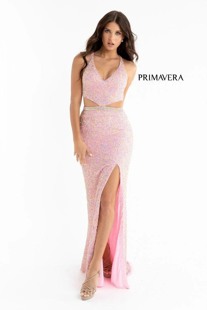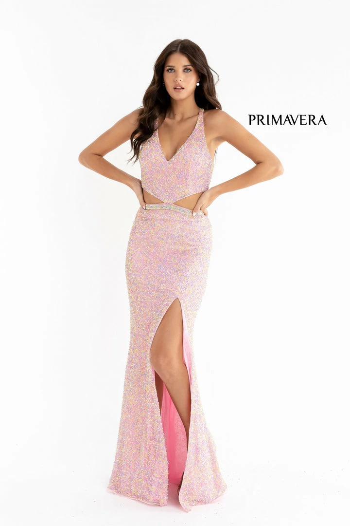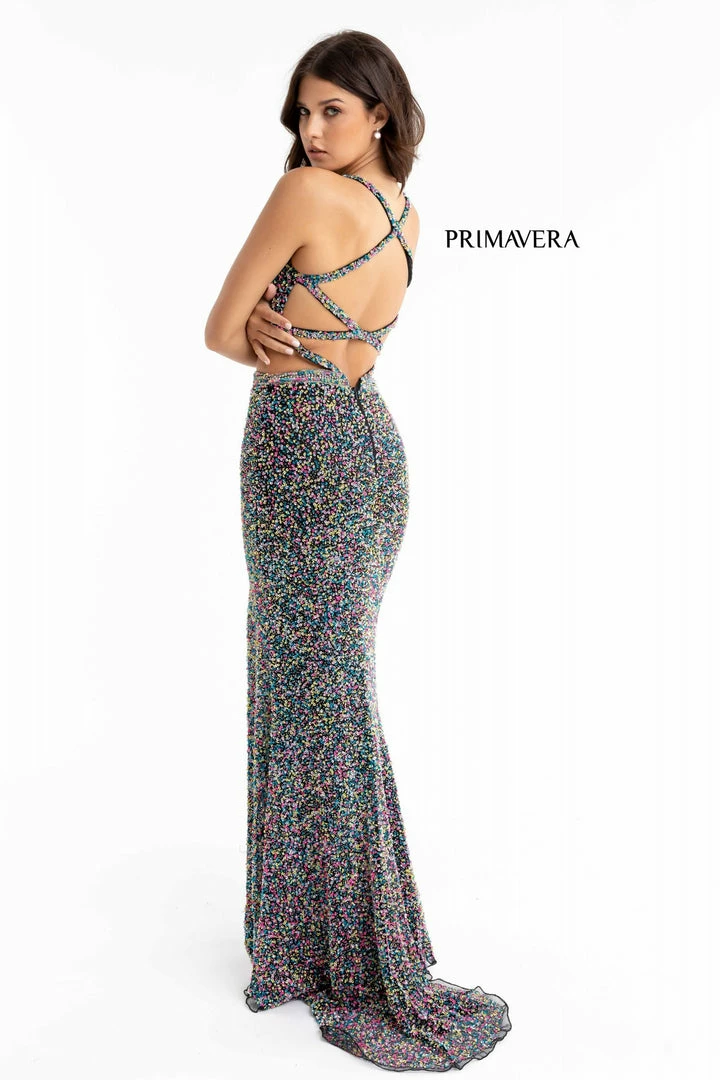 Primavera Couture 3744 This prom dress has a multi colored pop to the sequins all the way down to the floor length skirt. The dress has a v neckline and cutouts at the waistline. The back has multiple crossing wide straps in the back. The long skirt has a slit.