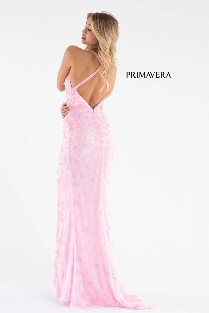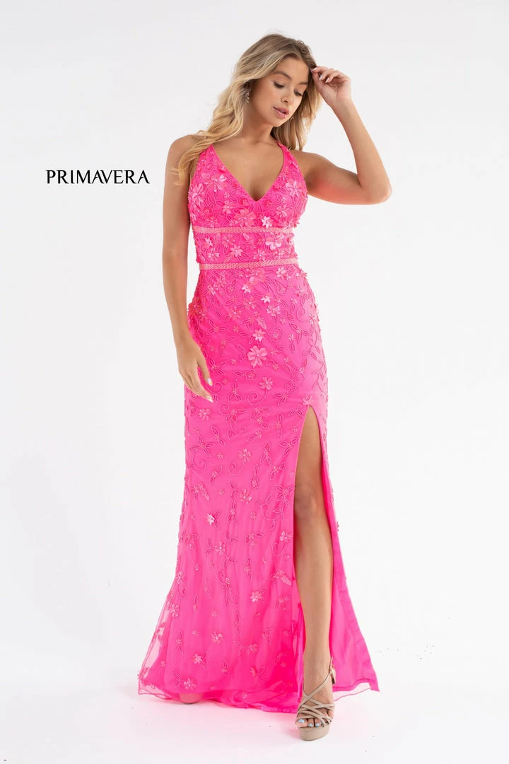 Primavera Couture 3746 This long beaded prom dress has 3D floral appliques throughout the dress along with beaded leaf design. It has a V neckline and wide straps that turn in to spaghetti straps that crisscross in the open back. This gown has a high waist beaded waistline and a mid waist beaded waistline. It ends with a side slit and sweeping train.