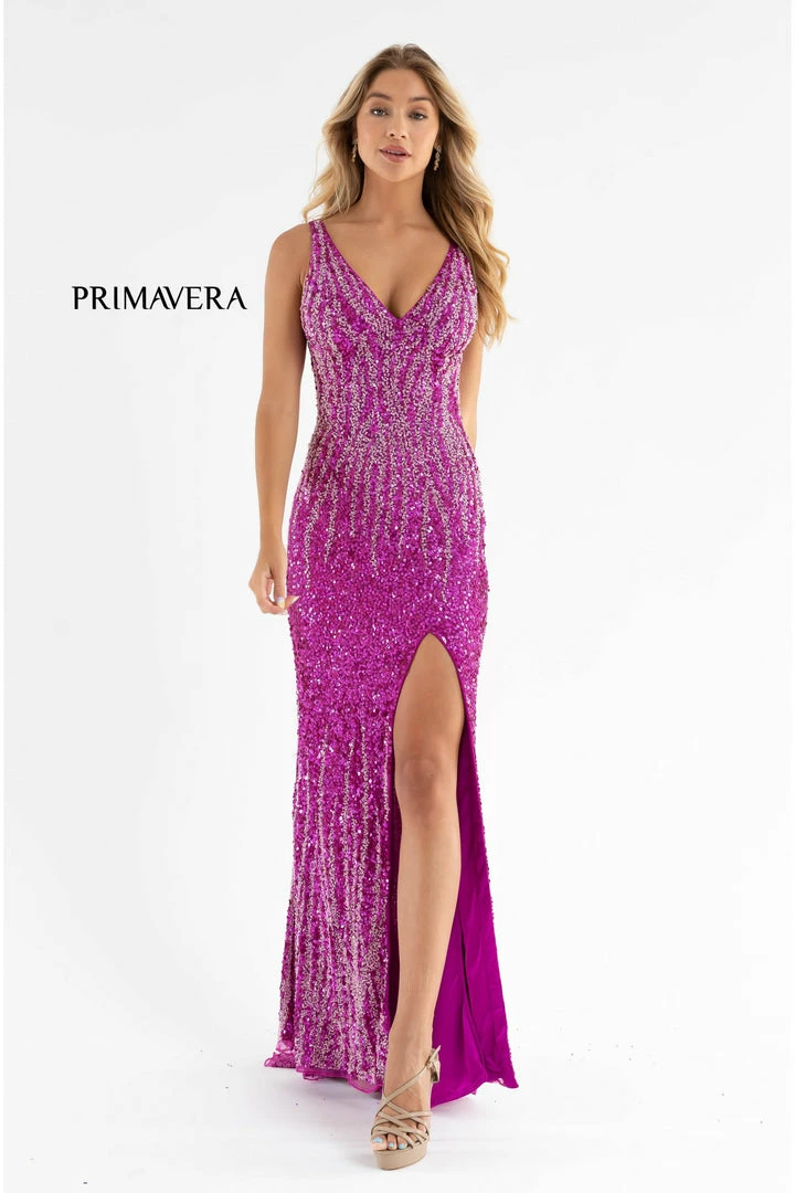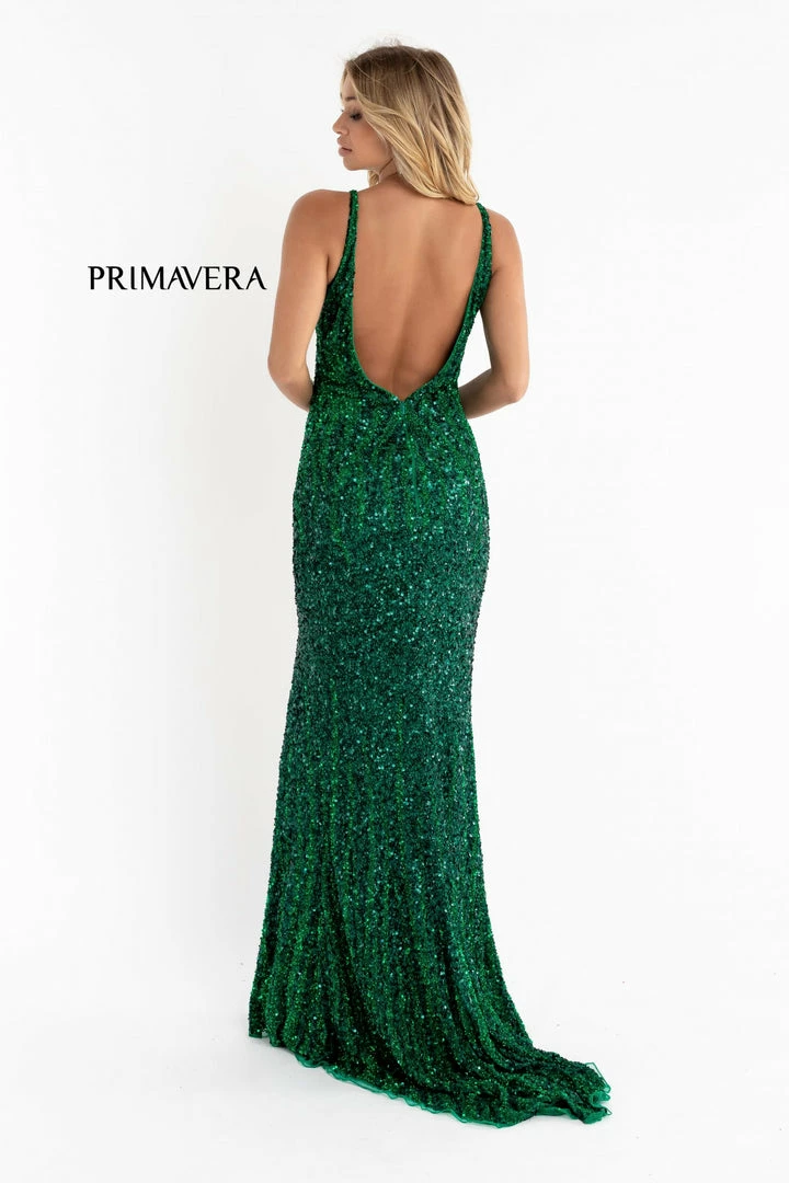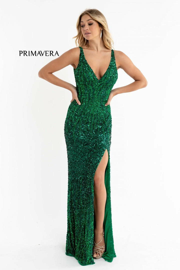 Primavera Couture 3751 This is an iridescent sequins prom dress with a v neckline and v back. It has streams of contrasting sequins on the bodice and bottom of the floor length skirt. It does have a slit and sweeping train.Â