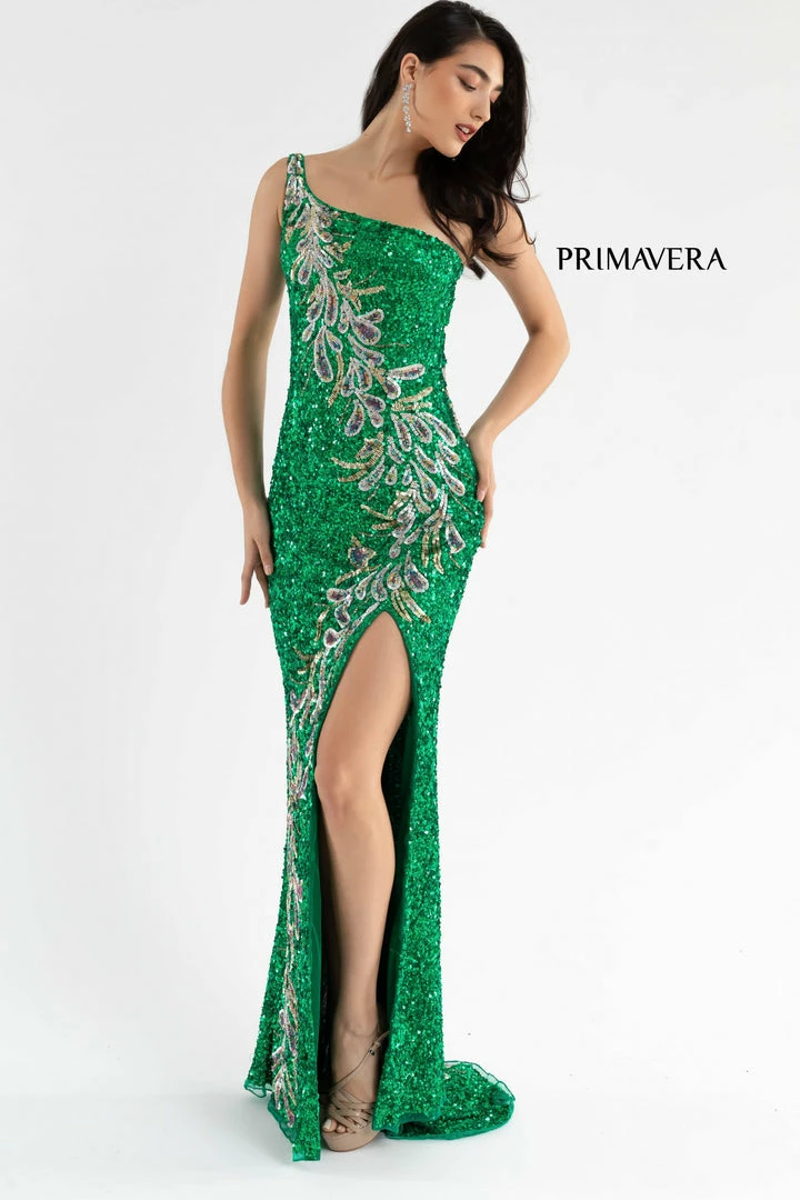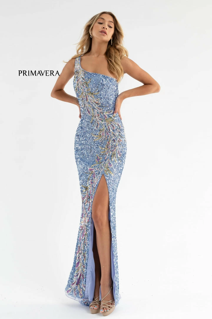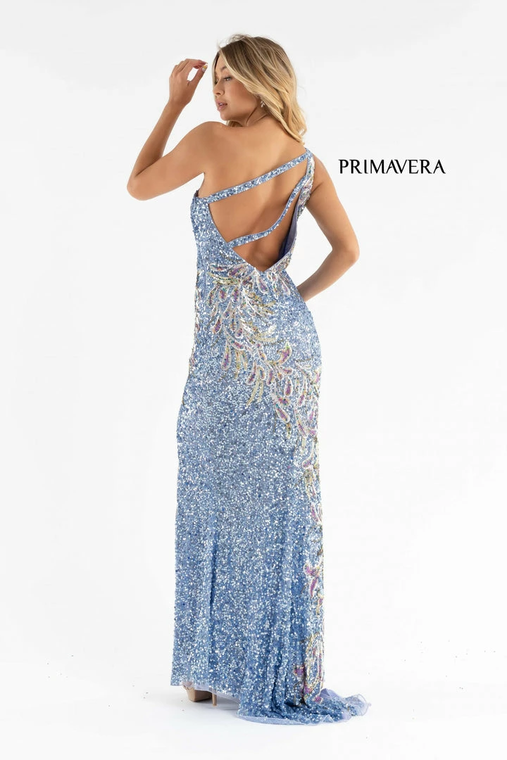 Primavera Couture 3753 This is a one shoulder prom dress with two straps that cross across the open back. The evening gown has a beautiful contrasting sequined pattern that wraps gently around the dress to the floor. It has a slit and sweeping train.