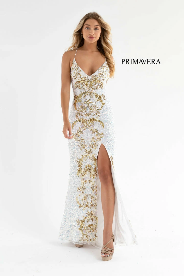 Primavera Couture 3755 This long Prom Dress is sequined throughout with a stream of floral sequin details flowing down the front of the gown. It has a lace up tie open back with a v neckline and ends with a slit and sweeping train.