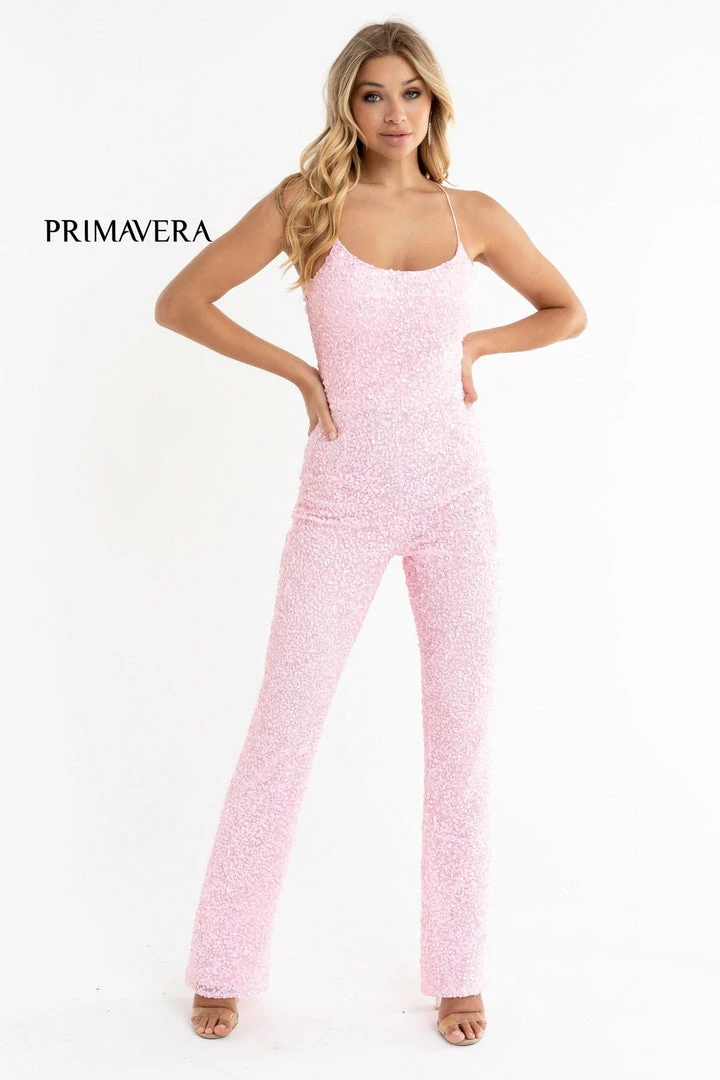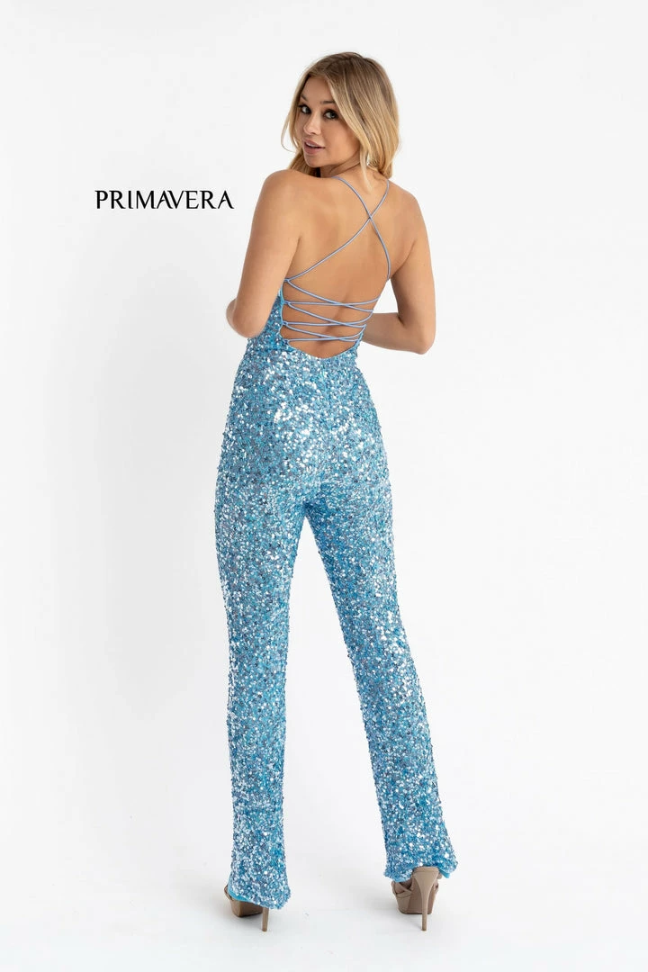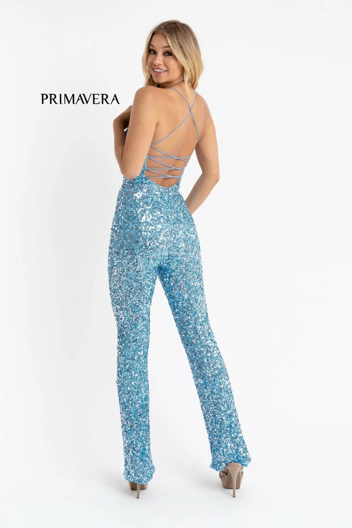 Primavera Couture 3774 This is a formal all sequined Jumpsuit for Prom, Pageant, Evening Events, Parties or whatever you want to wear it for. It is all sequins with a scoop neckline and thin spaghetti straps that lace up and tie in the back.