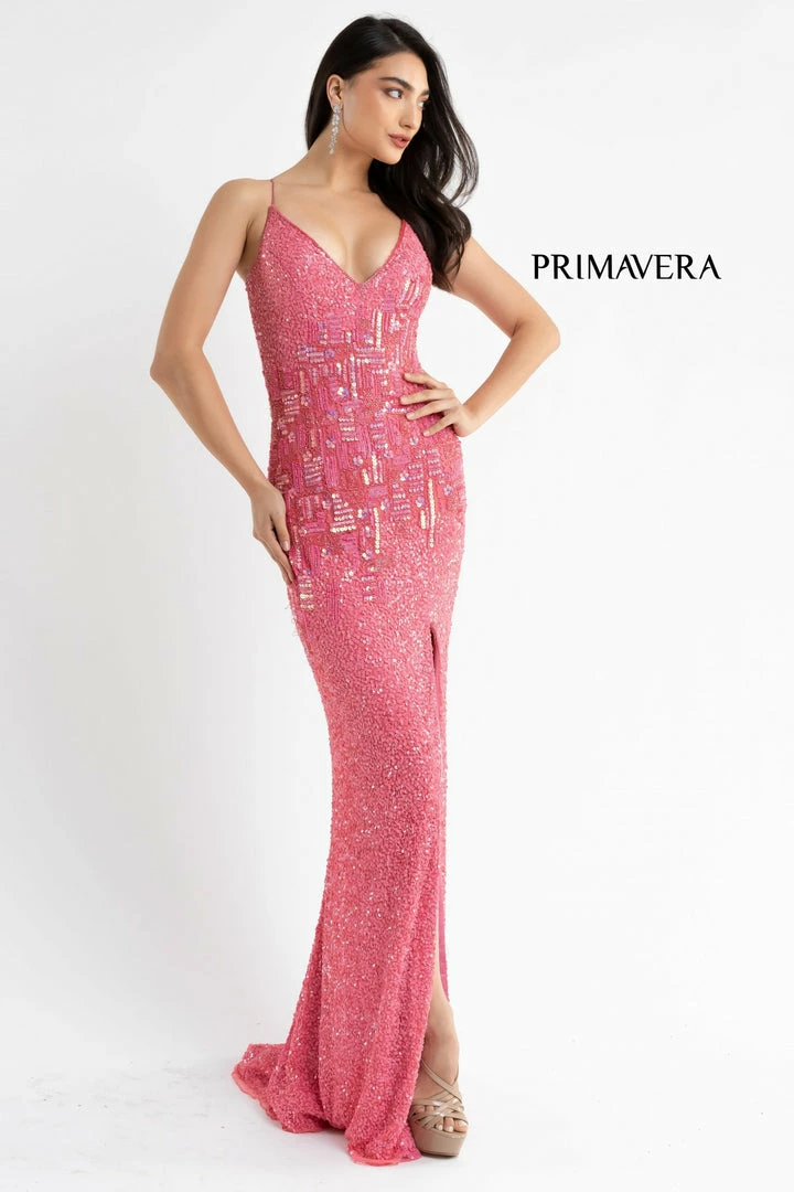 Primavera Couture 3784 This is an all sequins prom dress with a checker beading pattern at the waistline. It has a v neckline and a side slit with a sweeping train.