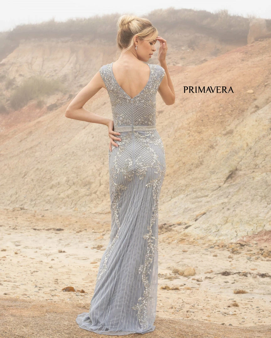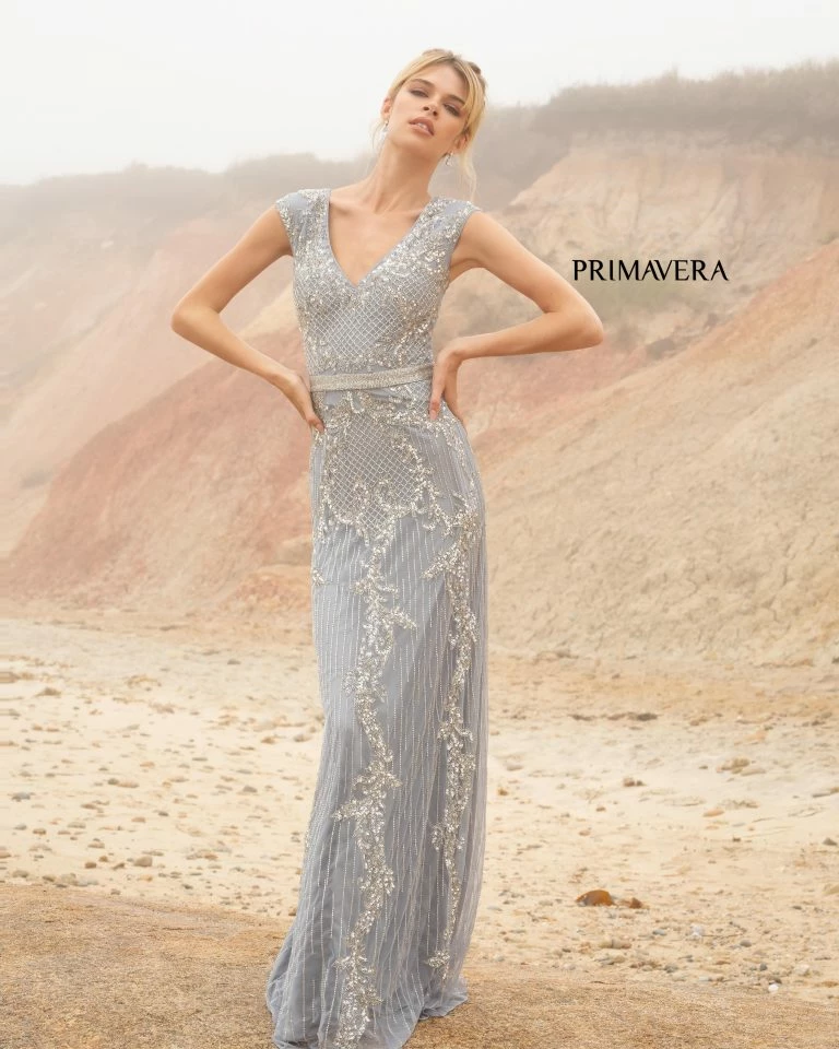 Primavera Couture 3794 This is a fully sequined Prom Dress with a V neckline and v mid back. This evening gown features cap sleeves and a beaded waistline. It is beaded in a beautiful pattern to accentuate and elongate the body. This dress is a good choice for a formal event, mother of the bride or prom dress.