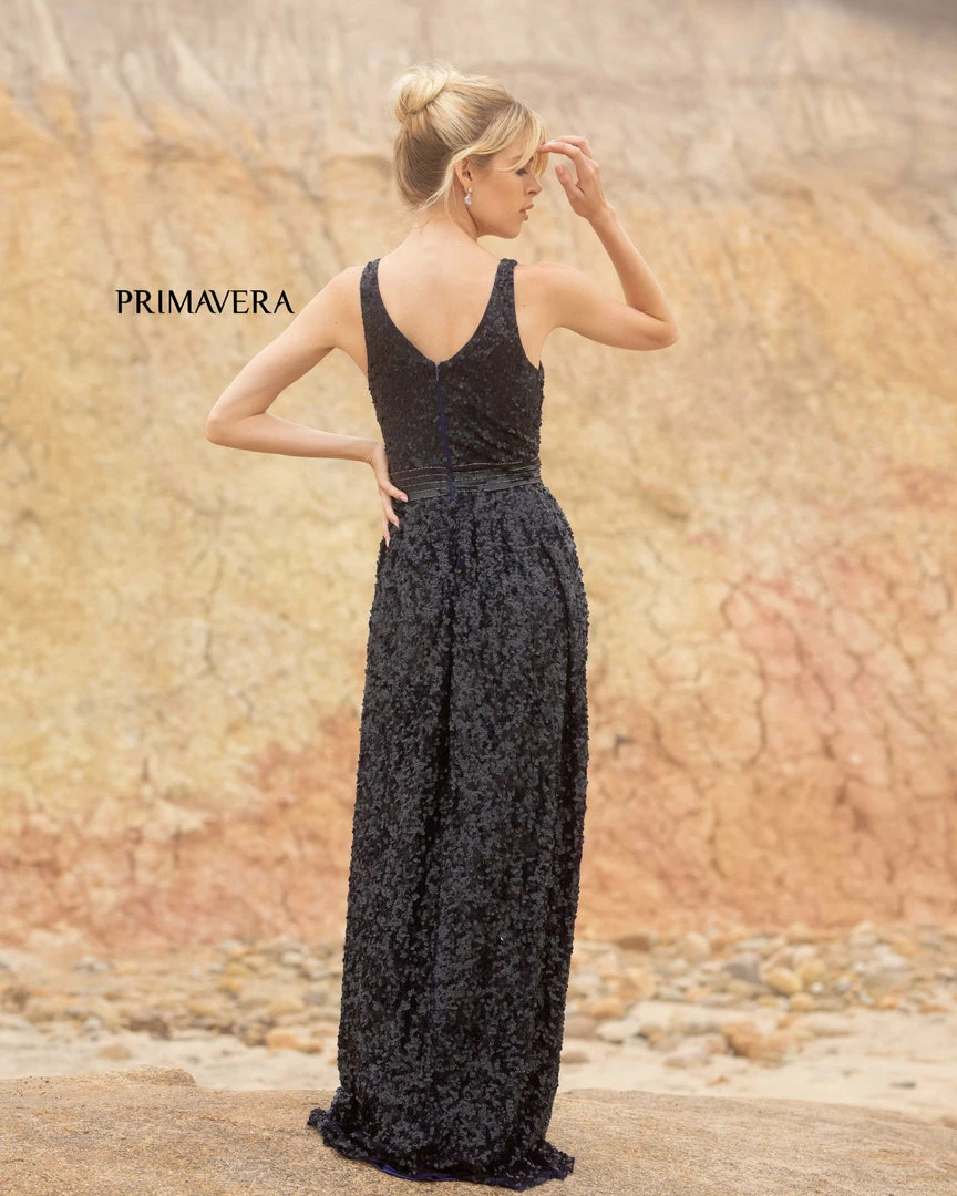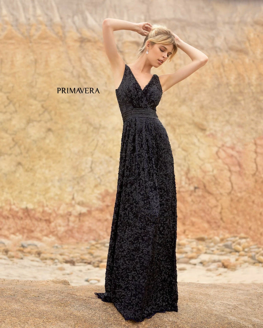 Primavera Couture 3795 This is a beautiful all sequins Prom and Evening Gown. It has a wrap style V neckline with ruching at the bodice and wide straps that form a high V back. The waistline is beaded and the long A line skirt is pleated at the waistline.Â