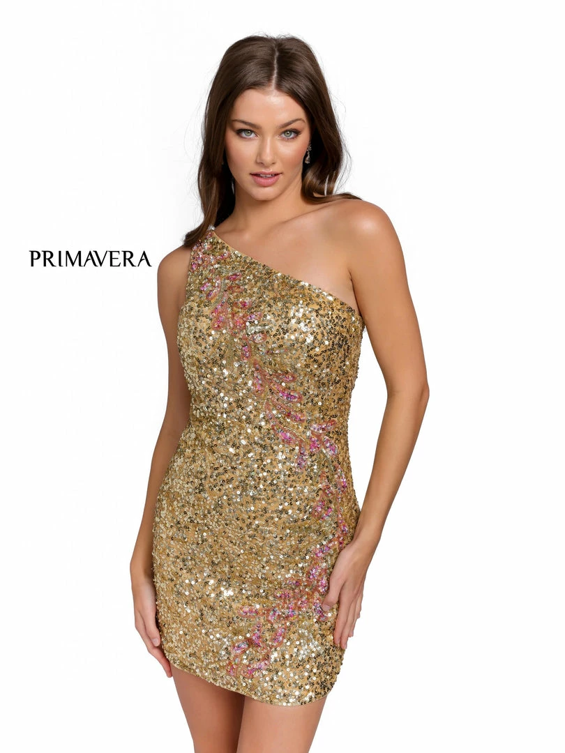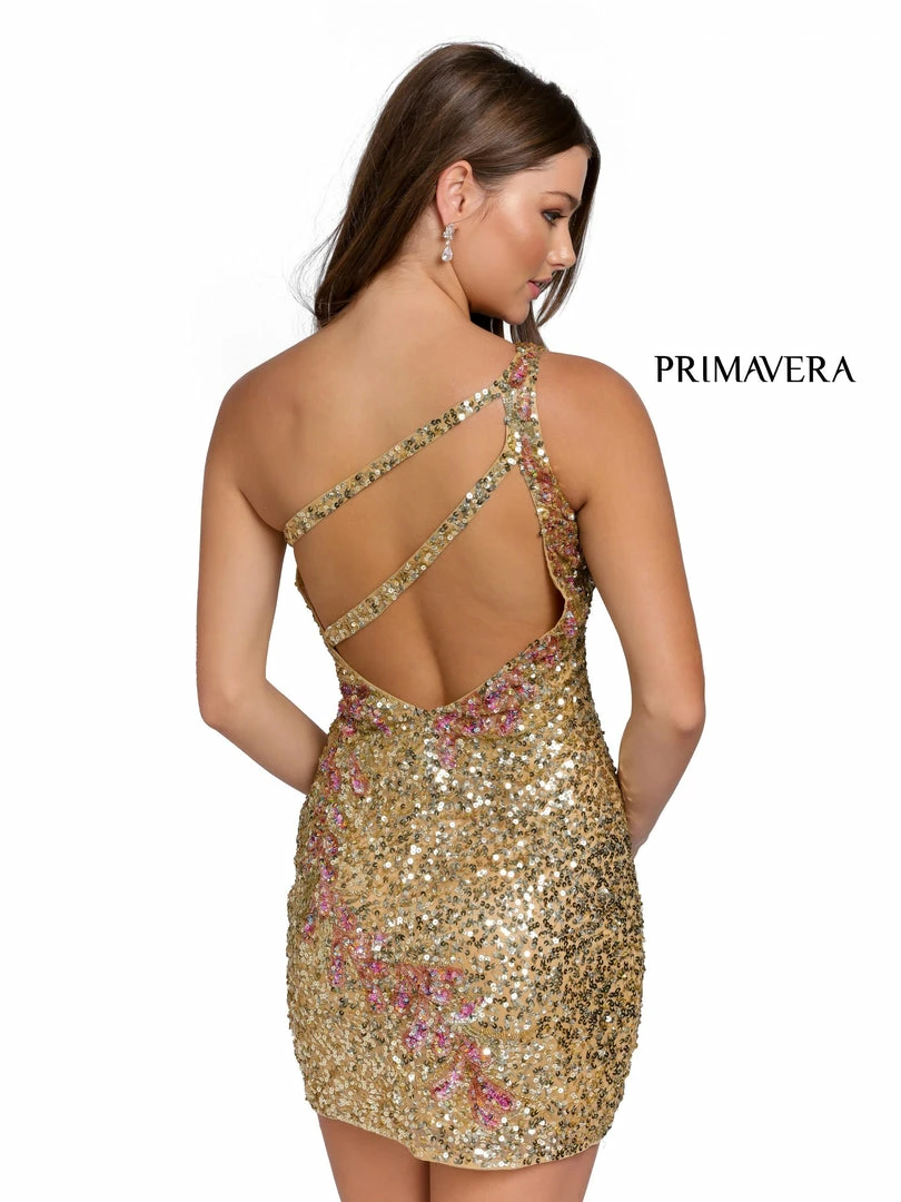 Primavera Couture 3864 Short 2022 Homecoming dress Fitted sequin beaded cocktail dress. This cocktail dress has a one shoulder strap that doubles into two in the open back style. The sequins are detailed with subtle floral patterns that curve through the dress.
