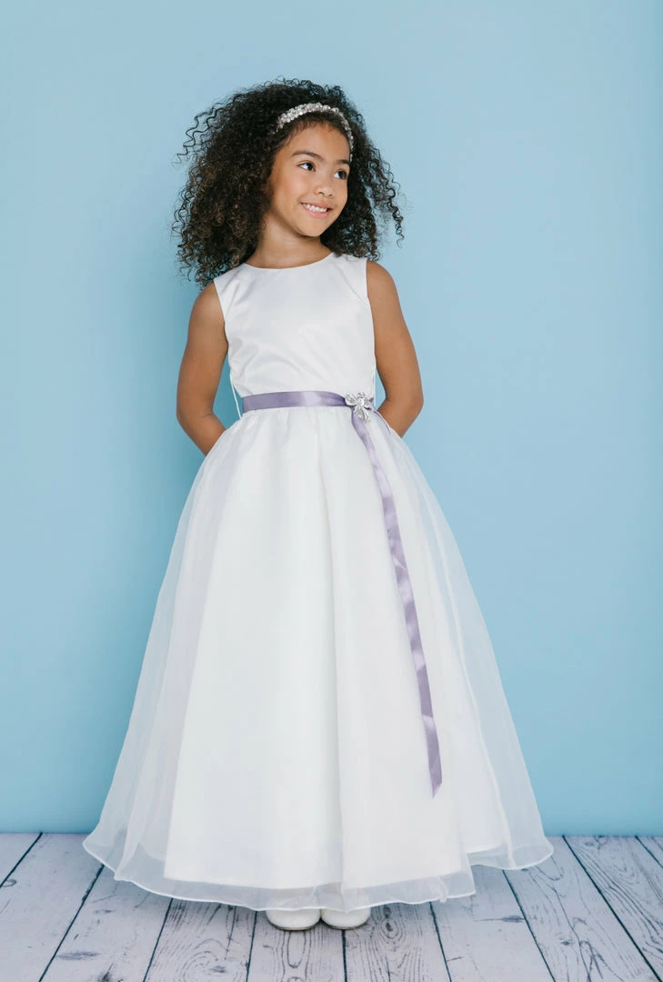 Rosebud Fashions Style 5109 is a full length sleeveless dress with a scoop neckline. The natural waist is accented with a satin ribbon and broach. Satin buttons cover the zipper. Flower Girl dress, First Communion