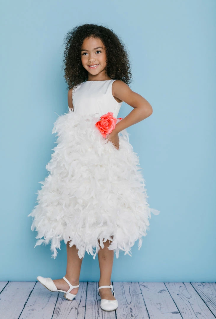 Rosebud Fashions Style 5120 is a T-length dress with a feather skirt and a satin top with a V neck in the back. The waist is accented with a ribbon that ties in the back with a flower. Satin buttons cover the zipper. Rosebuds Tea length flower girl dress feather skirt.
