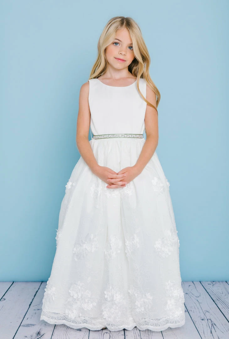 Rosebud Fashions Style 5128 is a full length sleeveless dress with a scoop neckline. The dress is covered with a 3D flower lace Appliques. The waist is accented with an Embellished 27/28 bling ribbon that ties in the back. Satin buttons cover the zipper. Flower Girl Dress & First Communion Gown.