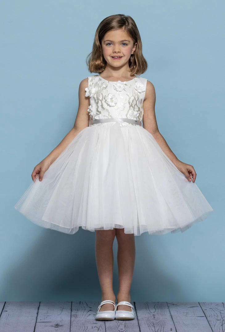 Rosebud Fashions Style 5135 is a sleeveless dress with a beaded satin bodice and a knee length tulle skirt. The ribbon at the waist ties to a bow in the back. Satin buttons cover the zipper. Short Flower Girl Dress, Girls Formal Party Dress.
