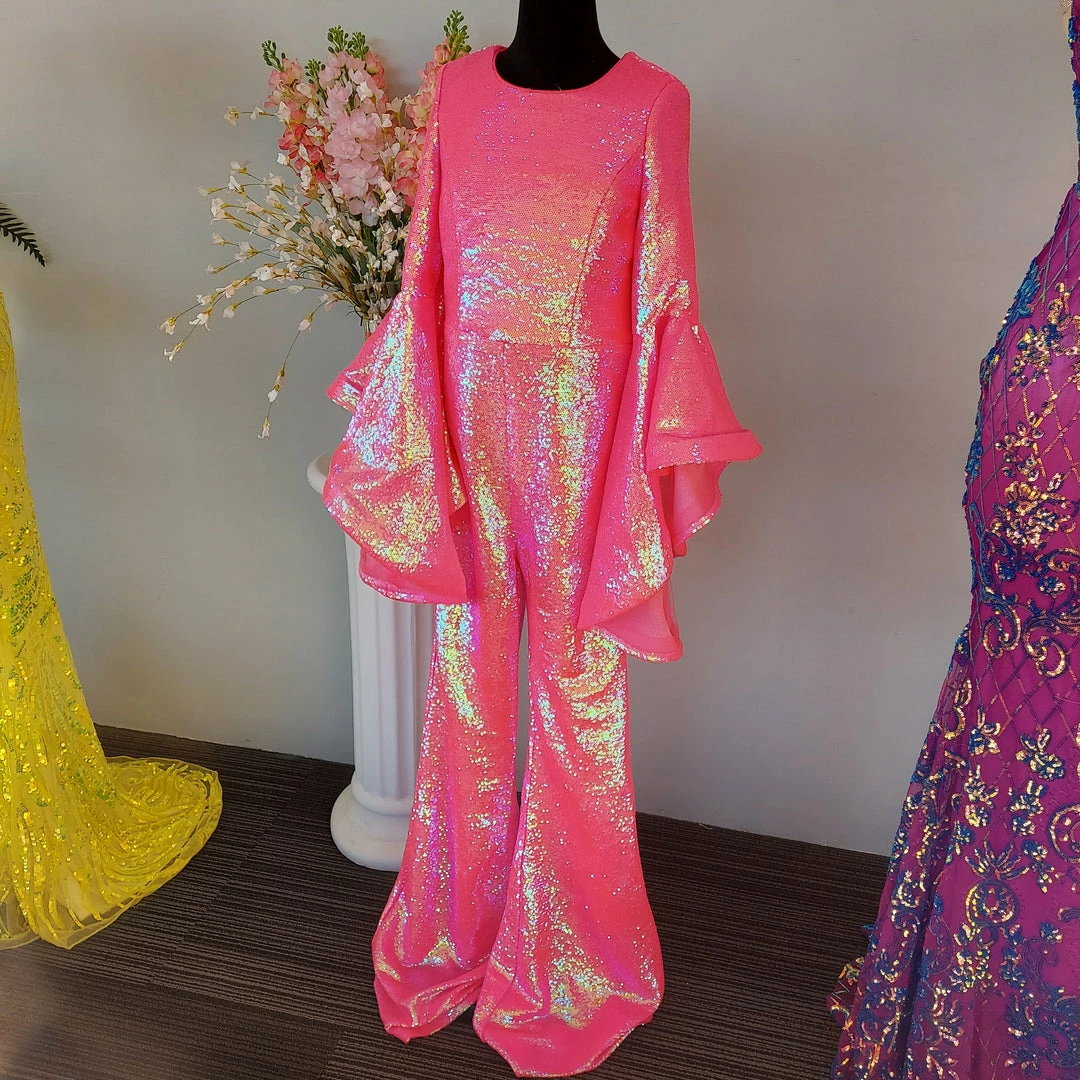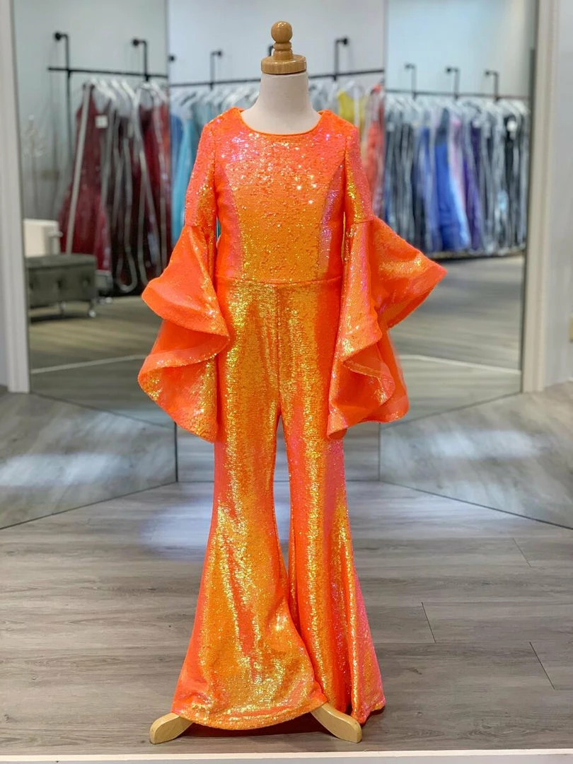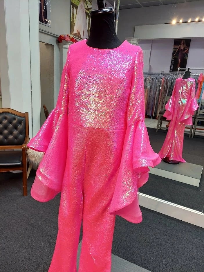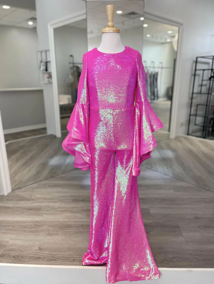 Ashley Lauren 8071 is a stunning iridescent sequin shimmering formal jumpsuit for kids/girls! Featuring long bell sleeves and flared legs. Great for Pageant Fun Fashion!