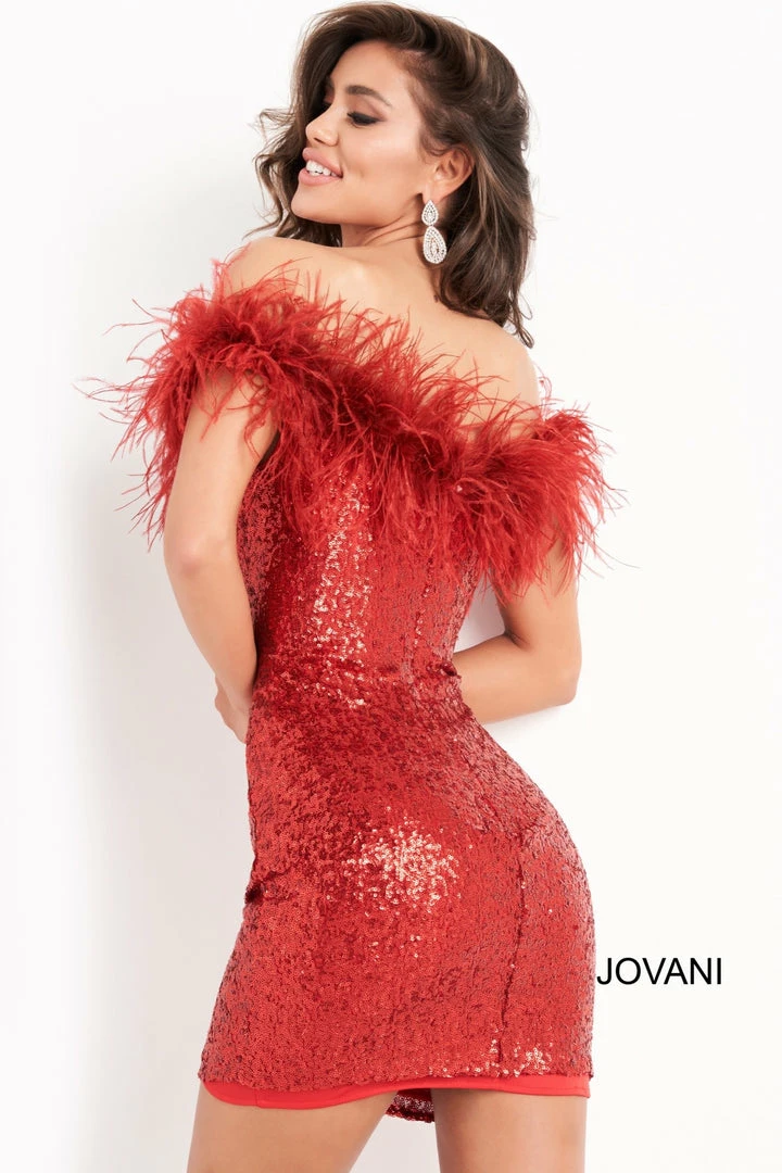 Jovani 06167 is a short fitted sequin cocktail evening dress. Featuring a straight neckline with off the shoulder feather embellished straps. Fitted Stretch Sequin bodice is perfect for any formal event or occasion! Sexy wedding reception dress in Ivory or Little black dress.